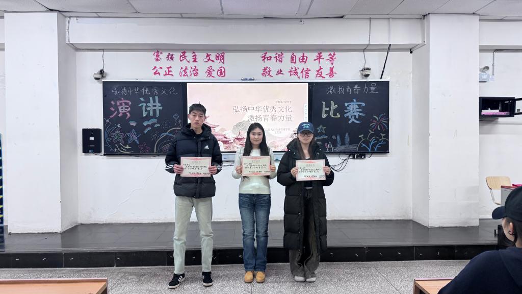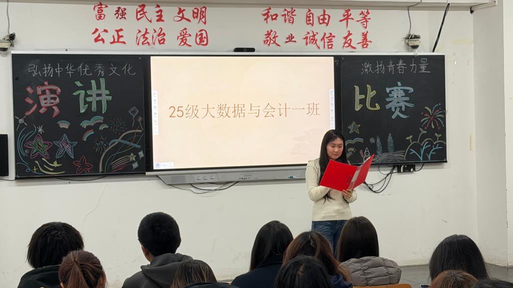 本次比赛自12月10日启动以来,得到全系学生的积极响应,经过班级推选,共有18名选手脱颖而出。比赛现场,选手们紧扣“文化自信”这一核心主题,或结合中华优秀传统文化的博大精深,从诗词歌赋、非遗技艺中挖掘文化魅力或立足新时代文化发展成果,讲述国货崛起、文旅融合的鲜活案例或分享自身在文化传承、志愿服务中的实践经历,抒发青年一代传承文化根脉、勇担时代使命的决心。他们的演讲慷慨激昂、声情并茂,既有深刻的思想内涵,又有真挚的情感流露,深深感染了在场的每一位观众,赢得阵阵热烈掌声。最终有三名同学脱颖而出他们分别是:第一名2025级大数据与会计一班秦伊濛、第二名2024级大数据与会计三班石璐、第三名2025级电子商务二班樊涑畅,经济管理学院要以此次比赛为契机,不断加深对中华优秀传统文化、革命文化和社会主义先进文化的理解,将文化自信内化于心、外化于行,在学习和实践中锤炼本领,用青春书写无愧于时代的华章。