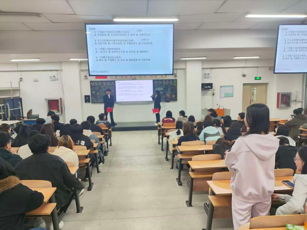 比赛现场气氛热烈、高潮迭起。各参赛队伍精神饱满、从容应战,在必答题环节稳扎稳打,精准作答党的理论与专业知识,抢答题环节反应敏捷、你追我赶,围绕学生手册中的安全规范、行为准则快速抢答,风险题与情景模拟环节中,选手们结合校园实际案例,深入解读宿舍安全隐患排查等实际问题,展现出扎实的知识积累与较强的实践应用能力。台下观众全程热情参与,互动答题环节踊跃举手,现场掌声与喝彩声此起彼伏,营造出“以赛促学、以学促行、知行合一”的浓厚氛围。经过多轮激烈角逐,大赛最终第一名2024级电子商务一班、第二名2024级大数据与会计三班、第三名2024级市场营销班。