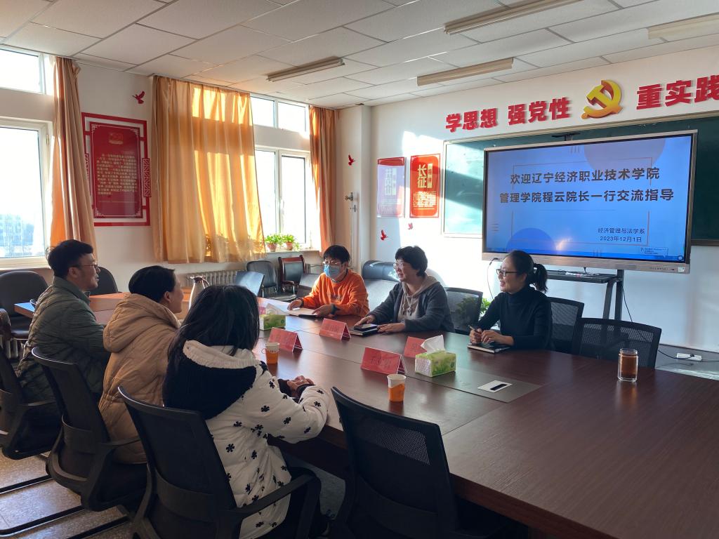 12月1日上午,辽宁经济职业技术学院管理学院院长程云一行3人到我院交流指导。经济管理与法学系主任苏日娅、副主任邬改利、教务科科长吴晓慧参加了此次交流。