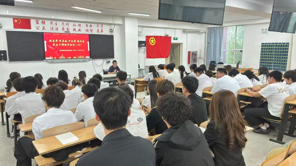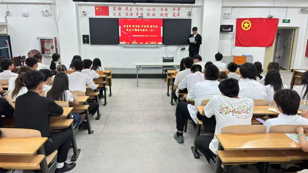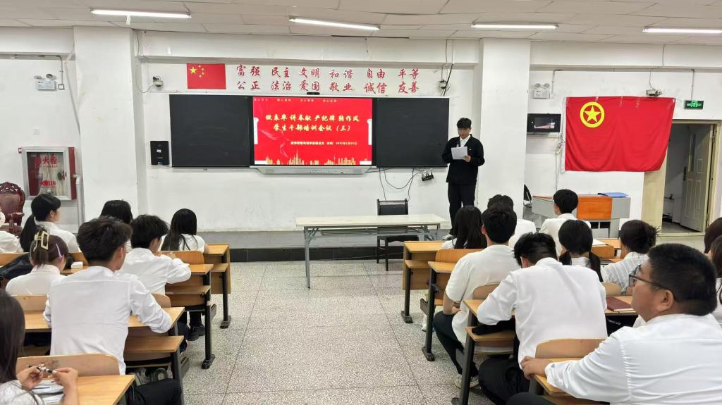 为深入学习贯彻习近平新时代中国特色社会主义思想,进一步提升学团干部综合素质,强化责任担当,2025年5月28日在品学楼401教室经济管理与法学系团总支组织召开本学期第三次“做表率 讲奉献 严纪律 转作风”主题学团干部培训会议。经济管理与法学系团总支书记包春良以及全体学生干部参加了培训会议。