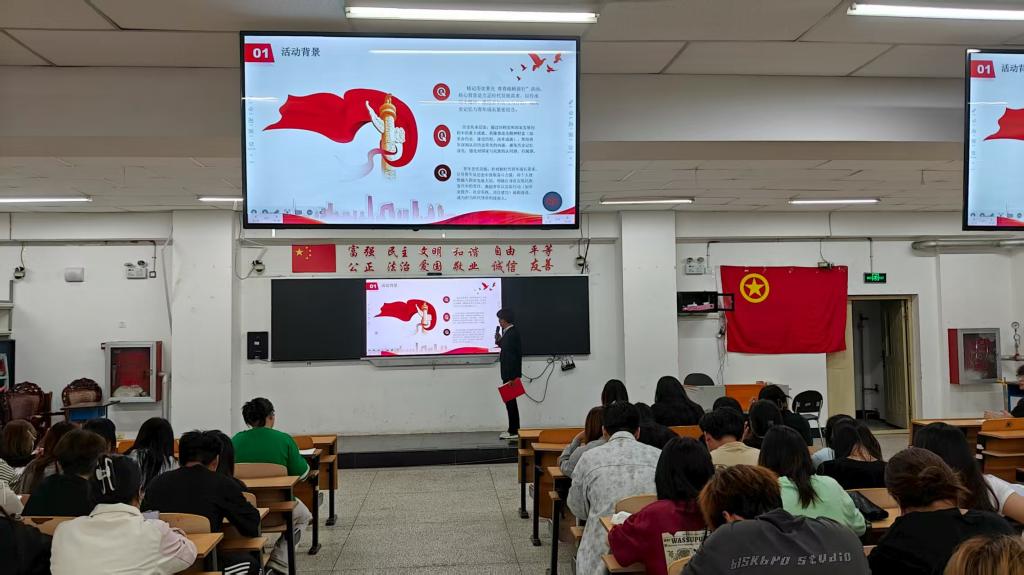 活动伊始,伴随着庄严的《共青团团歌》旋律,全体团员起立肃立,高唱团歌,嘹亮的歌声回荡在教室中,瞬间点燃了现场的爱国热情与青春氛围,也正式拉开了本次主题团日活动的序幕。在 “历史荣光・精神传承” 学习环节,2023级法律事务一班的马千羽同学“从历史中汲取青春奋进的力量” 为题,为团员青年们带来了一场生动的主题宣讲。她结合中国共产党领导青年运动的百年历程,从“五四运动”中青年学子的爱国呐喊,到新时代青年在科技创新、乡村振兴、志愿服务等领域的担当作为,用一个个鲜活的历史事件、一组组详实的数据和一个个感人的青年榜样故事,系统梳理了不同历史时期青年群体与国家命运同频共振的奋斗轨迹。同时,她还特别结合经济管理与法学专业特色,鼓励同学们将专业学习与国家发展需求相结合,在法治建设、经济发展等领域找准自身定位,让青春在服务国家战略中绽放光彩。宣讲过程中,现场同学认真聆听、不时记录,深刻体会到 “青年兴则国家兴,青年强则国家强” 的深刻内涵。此外,活动现场通过PPT讲解、视频观看等形式,展示了中国共产党领导人民在革命、建设、改革时期取得的辉煌成就,以及青年群体在其中的重要贡献,同学们纷纷驻足参观,不时相互交流感悟,进一步加深了对历史的认知和对使命的理解。