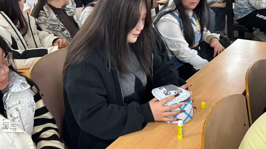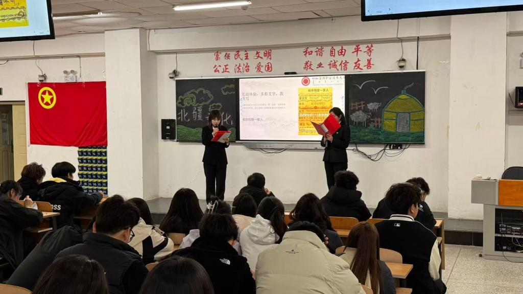 活动在全体成员齐唱团歌中拉开序幕,激昂的歌声展现了青年学子昂扬向上的精神风貌。随后,活动围绕“北疆初识:山河与多元底色”“文化瑰宝:游牧精神的活态传承”“身临其境:可触可写的文化”“智慧交锋:北疆知识赛”“青春责任与未来”五大板块展开宣讲。宣讲从北疆壮美的自然风光入手,介绍了阿尔泰山、天山等山脉的雄伟,喀纳斯湖、伊犁河等水域的秀美,以及草原、沙漠、森林等多样地貌。随后,通过讲解哈萨克族、维吾尔族、蒙古族等多个民族的文化特色,展现了北疆“多元一体”的民族格局。在“文化瑰宝”环节,同学们通过图片、视频等形式,了解了哈萨克刺绣、皮革毛毡、冬不拉制作等非遗技艺,感受了阿肯弹唱、黑走马舞蹈、十二木卡姆等歌舞艺术的魅力。活动还介绍了纳吾鲁孜节、那达慕大会等传统节庆,以及手抓肉、奶茶、熏马肉等特色饮食文化,生动展现了北疆人与自然和谐共生的智慧。互动环节将现场气氛推向高潮。“猜声音”游戏中,同学们通过聆听冬不拉、鹰笛等乐器声音,猜测其来源;“多彩文字临摹”环节,大家亲手书写少数民族文字,感受其独特魅力;“搭建蒙古包”体验中,同学们分组合作,亲手搭建微型蒙古包模型,体会游牧民族的居住智慧。