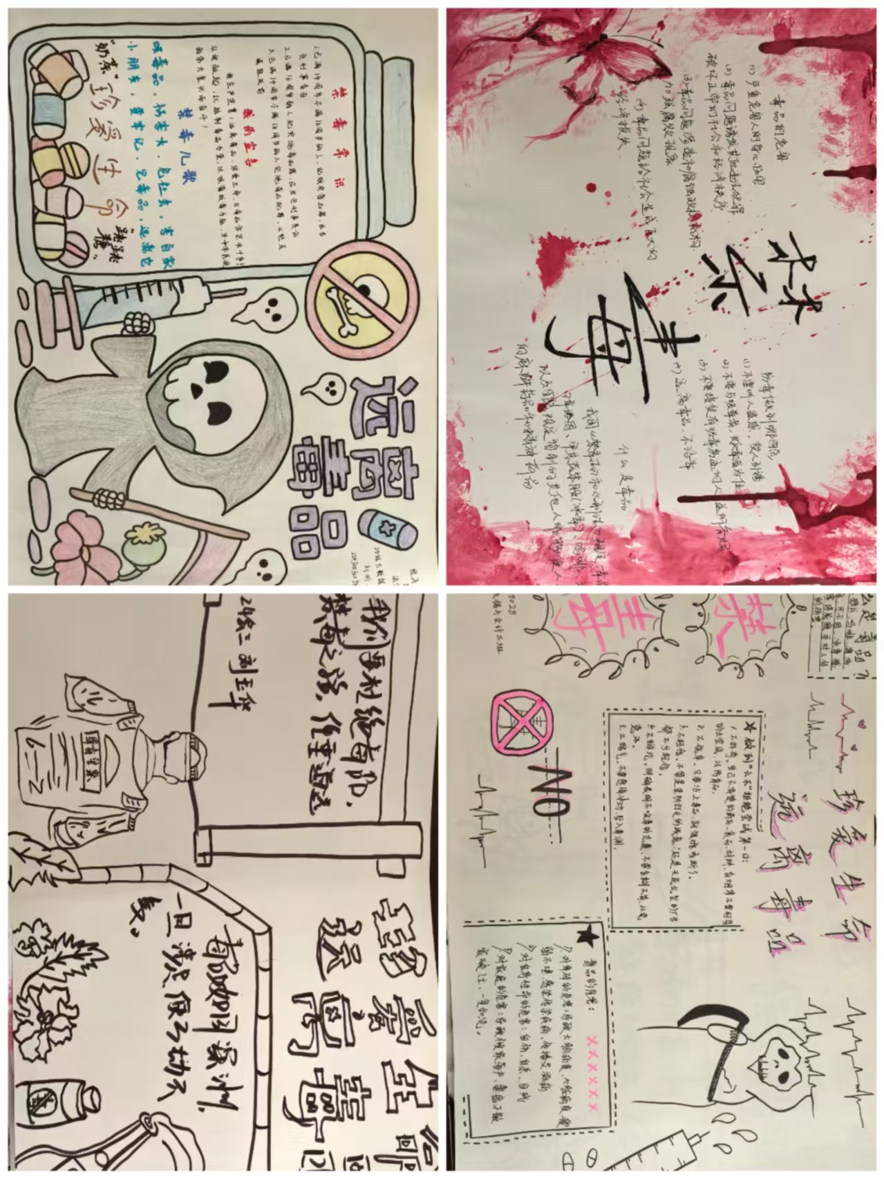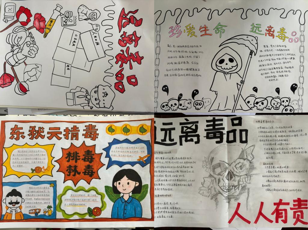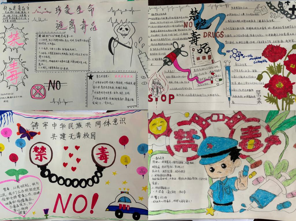 活动前期,通过系内公众号、班级群等多种渠道发布活动通知,详细阐述活动意义与要求,激发了同学们的创作热情,鼓励大家发挥创意,以手抄报为载体,展现对禁毒的理解与感悟。同学们积极响应,用手中的画笔、设计软件,围绕毒品的危害、禁毒法律法规、防毒拒毒方法等内容,创作出一幅幅主题鲜明、构思巧妙、视觉冲击力强的手抄报作品。有的作品以直观的毒品图像与触目惊心的吸毒后果形成强烈对比,警示人们远离毒品;有的通过生动形象的漫画形式,普及禁毒知识;还有的将禁毒理念与艺术美感相结合,呼吁大家积极参与禁毒行动。作品则以生动的文字和绚丽的色彩,宣传了禁毒法律法规和防毒拒毒方法,呼吁大家携手共建无毒校园
