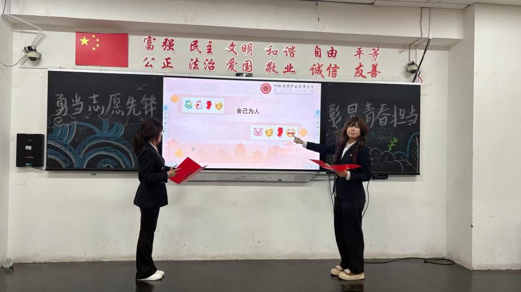 活动在庄严的团歌声中拉开序幕。分享会围绕“时代召唤——何以先锋,何以担当”“互动共勉——思想、智慧与情感共鸣”“成长答卷——在奉献中蜕变”“展望未来——让担当照亮前程”四大板块展开。主讲人从当代青年在志愿服务中的角色定位出发,阐释了“奉献、友爱、互助、进步”志愿精神在新时代的新表达,强调青年不仅是志愿活动的参与者,更应成为发起者、创新者和引领者。在“互动共勉”环节,现场设置了“先锋思辨场”“智慧解码站”与“祝福卡传递”等互动形式。学生们通过选择题竞答,深化对志愿服务核心原则的理解;通过Emoji猜词游戏,生动诠释“舍己为人”“助人为乐”等志愿精神关键词;在祝福卡上写下对彼此志愿之路的鼓励与期待,传递温暖与力量。活动现场氛围热烈,笑声与掌声不断,展现了青年学子对志愿服务的高度认同与情感共鸣。“成长答卷”部分通过真实案例与能力图谱展示,呈现了青年在志愿服务中硬技能与软实力的双重提升。从项目策划到应急处理,从共情力到领导力,志愿服务成为学生锻炼自我、拓宽视野、树立家国情怀的重要平台。多名学生代表分享了从“体验者”到“建设者”的身份转变历程,体现出志愿精神如何内化为人生底色,塑造乐观坚韧的品格。活动最后聚焦“展望未来”,围绕志愿服务专业化、可持续化与影响力提升展开讨论。同学们积极建言,提出应推动项目品牌化、管理精细化,并拓展数字包容、生态环保等新兴领域。全体参与者在“青春誓言”环节庄严承诺:以志愿之名,聚青春之火,担时代之责,让担当照亮前行的道路。