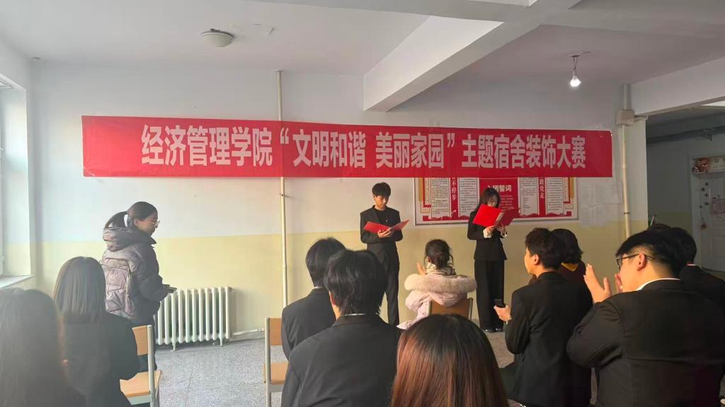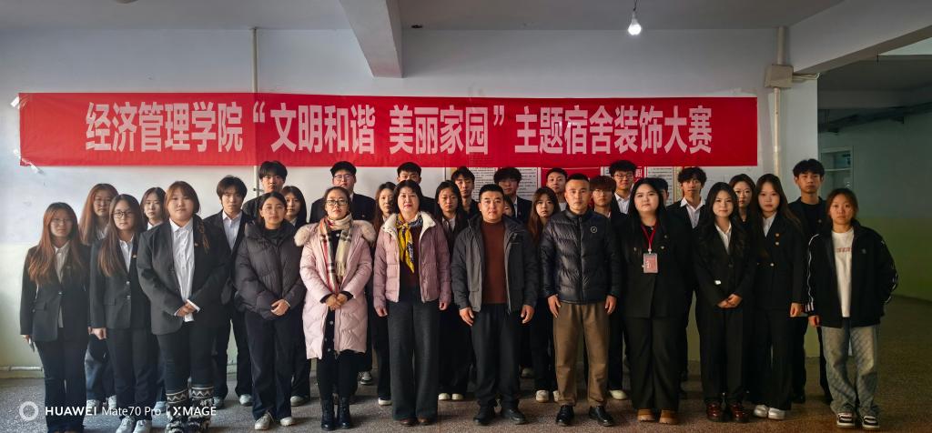 为丰富学生宿舍文化生活,营造文明和谐的住宿氛围,增强寝室成员之间的凝聚力与协作意识,经济管理学院于2025年12月9日下午在六号学生公寓区举办“文明和谐 美丽家园”主题宿舍装饰大赛。经济管理学院党总支书记葛风云、学生科科长包和平、副科长包春良,辅导员吴晓慧、吴小燕老师和二十届学生会干部参加本次活动。
