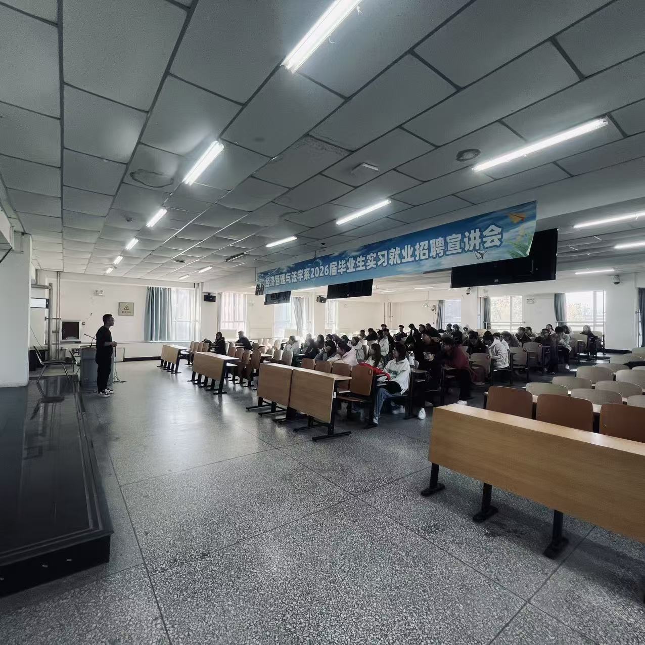 讲座结束后,招聘宣讲环节正式开启。内蒙古利诚实业有限公司通过 PPT 展示、视频播放等形式,介绍了公司发展历程、岗位需求、薪资福利及晋升路径,并针对学生关心的专业匹配度、实习机会等问题逐一解答。