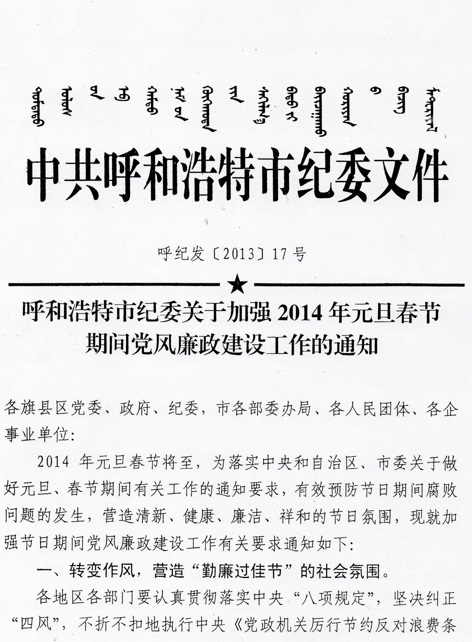 附件:1.呼和浩特市纪委《关于加强2014年元旦春节期间党风廉政建设工作的通知》(呼纪发〔2013〕17号)