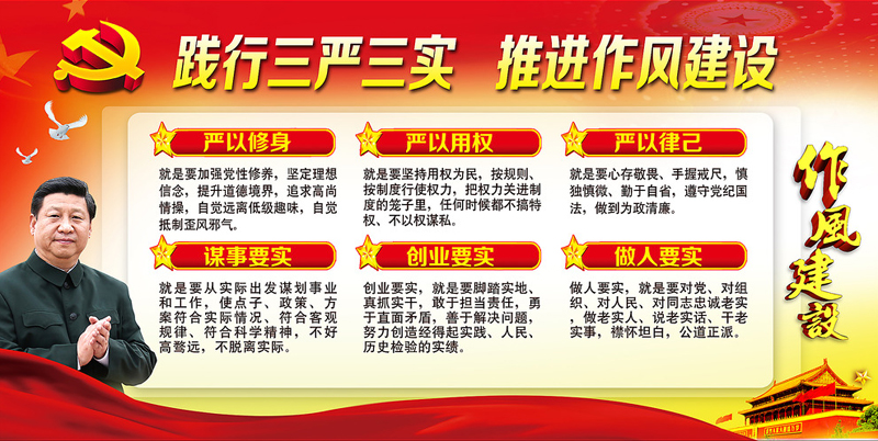 2014年3月9日,习近平总书记在十二届全国人大二次会议安徽代表团参加审议时,关于推进作风建设的讲话中,要求各级领导干部都要树立和发扬好的作风,既严以修身、严以用权、严以律己,又谋事要实、创业要实、做人要实。称为“三严三实”。