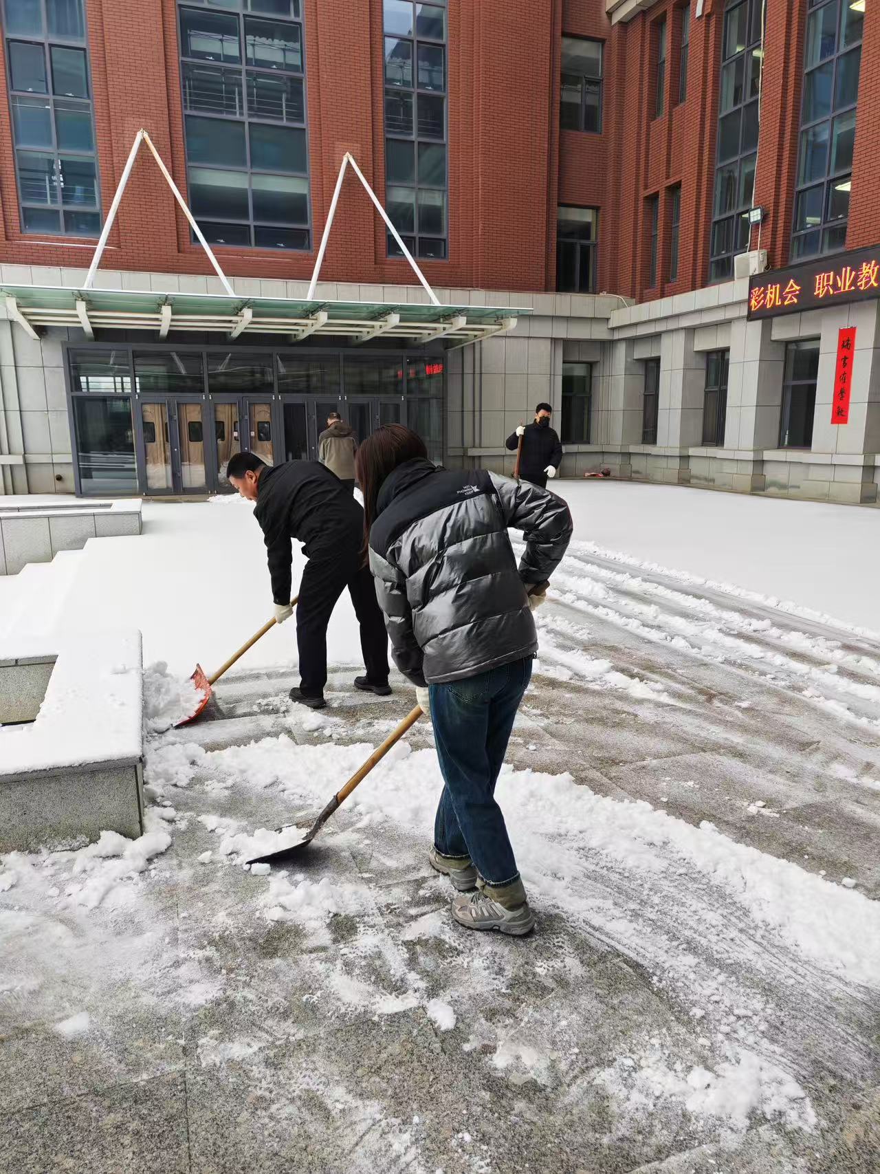 师生们不畏严寒,手持铁锹、扫帚等工具,分工协作。有的负责铲除积雪,有的忙着清扫碎冰,经过大家的共同努力,清扫出了一条“暖心路”,排除了校园内存在的出行安全隐患。本次志愿服务是对雷锋精神的生动诠释,大家在劳动中深刻领悟到了“把有限的生命投入到无限的为人民服务之中去”的真谛。