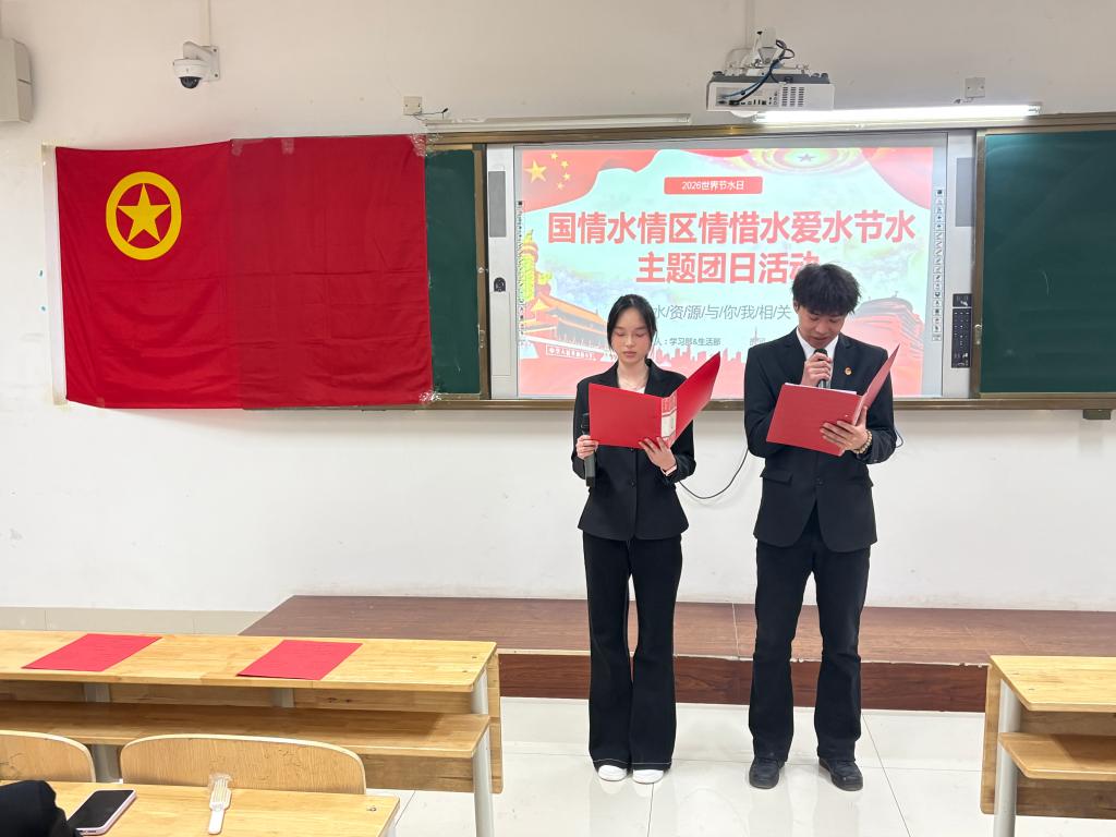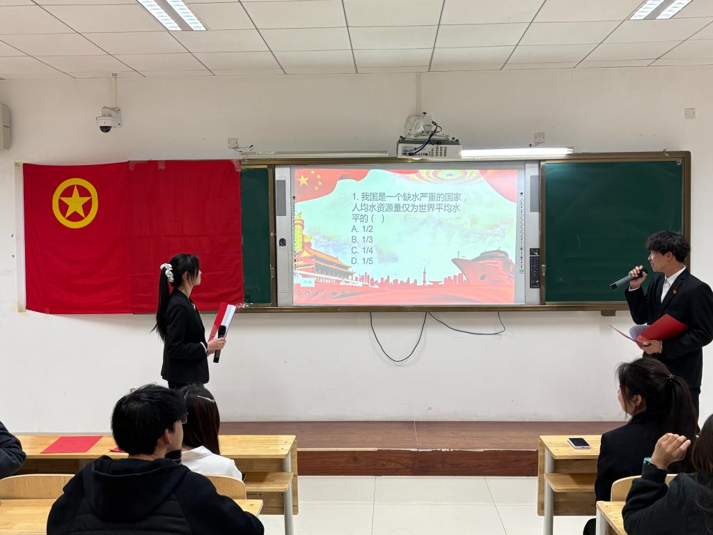 本次活动在庄严嘹亮的团歌中拉开序幕。朗诵节目字字恳切、情感饱满,主持 深情讲述我国水资源分布特点、区域水情现状与节水工作的重要意义,让惜水爱水的理念在声声诵读中浸润每位同学心田。知识问答环节围绕我国国情水情、区域水资源特点、节水小技巧、水资源保护政策等核心内容展开抢答互动,同学们踊跃参与、积极作答。