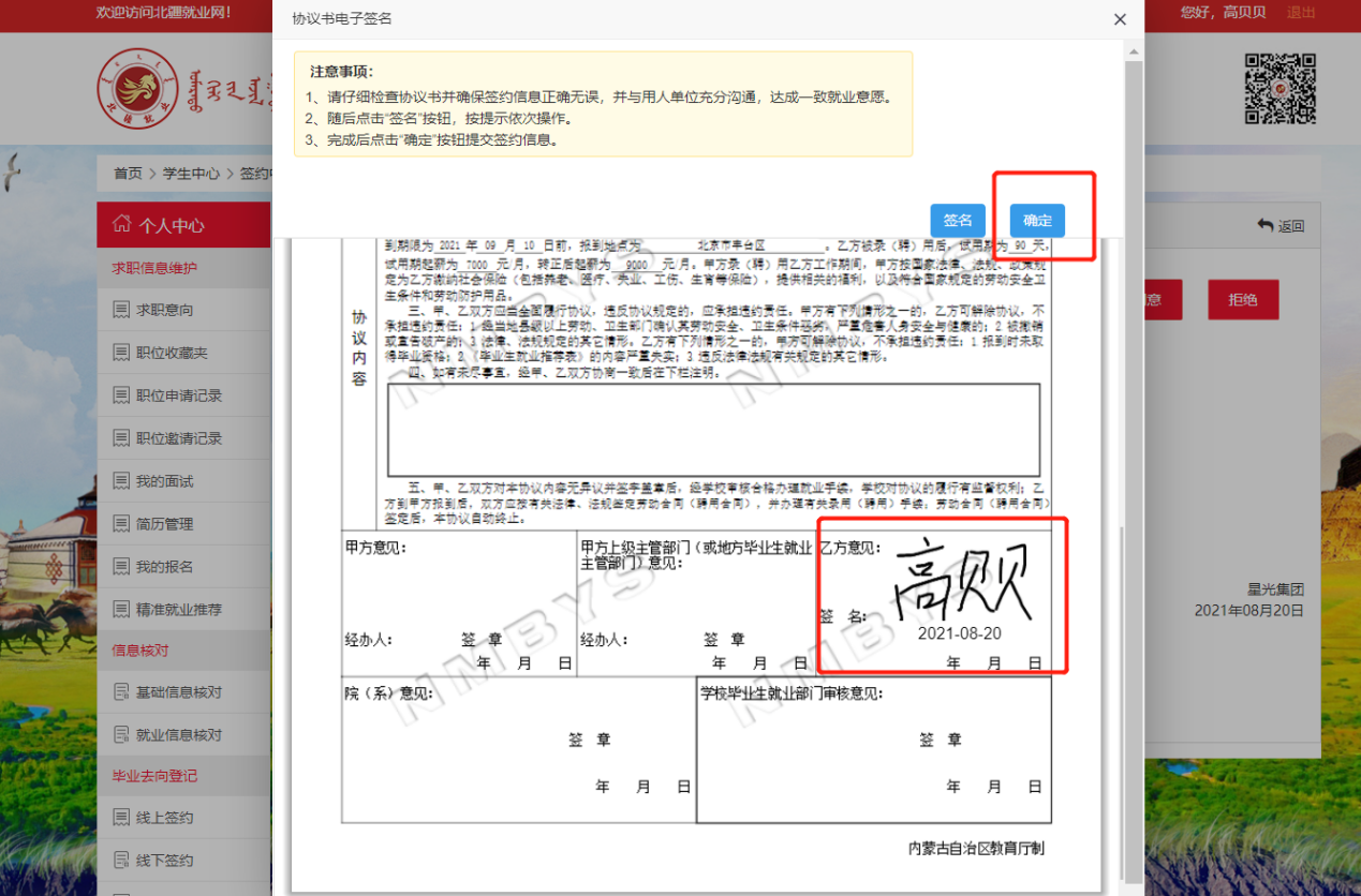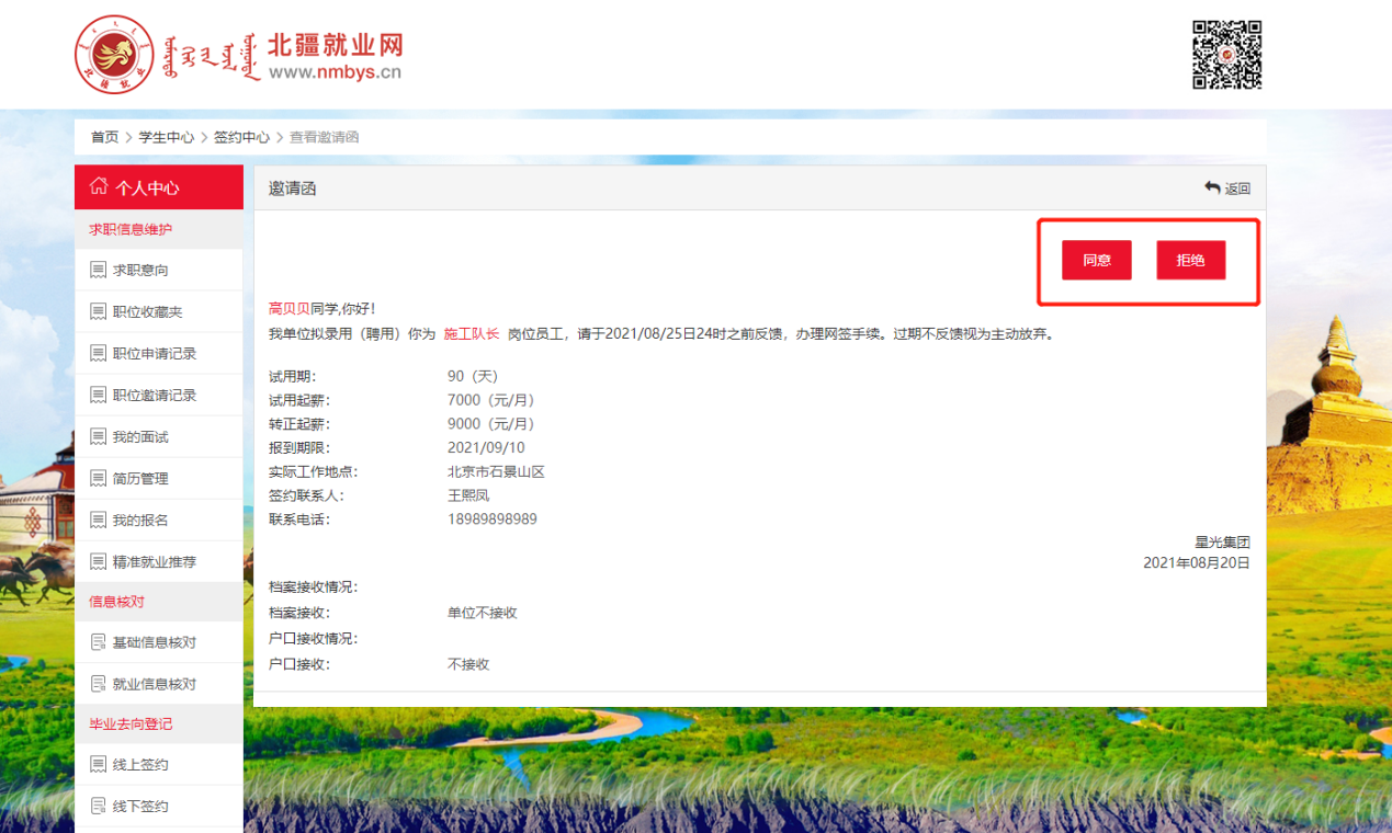 若拒绝与单位签约,则在邀请函里点击“拒绝”按钮,此次签约已拒绝。