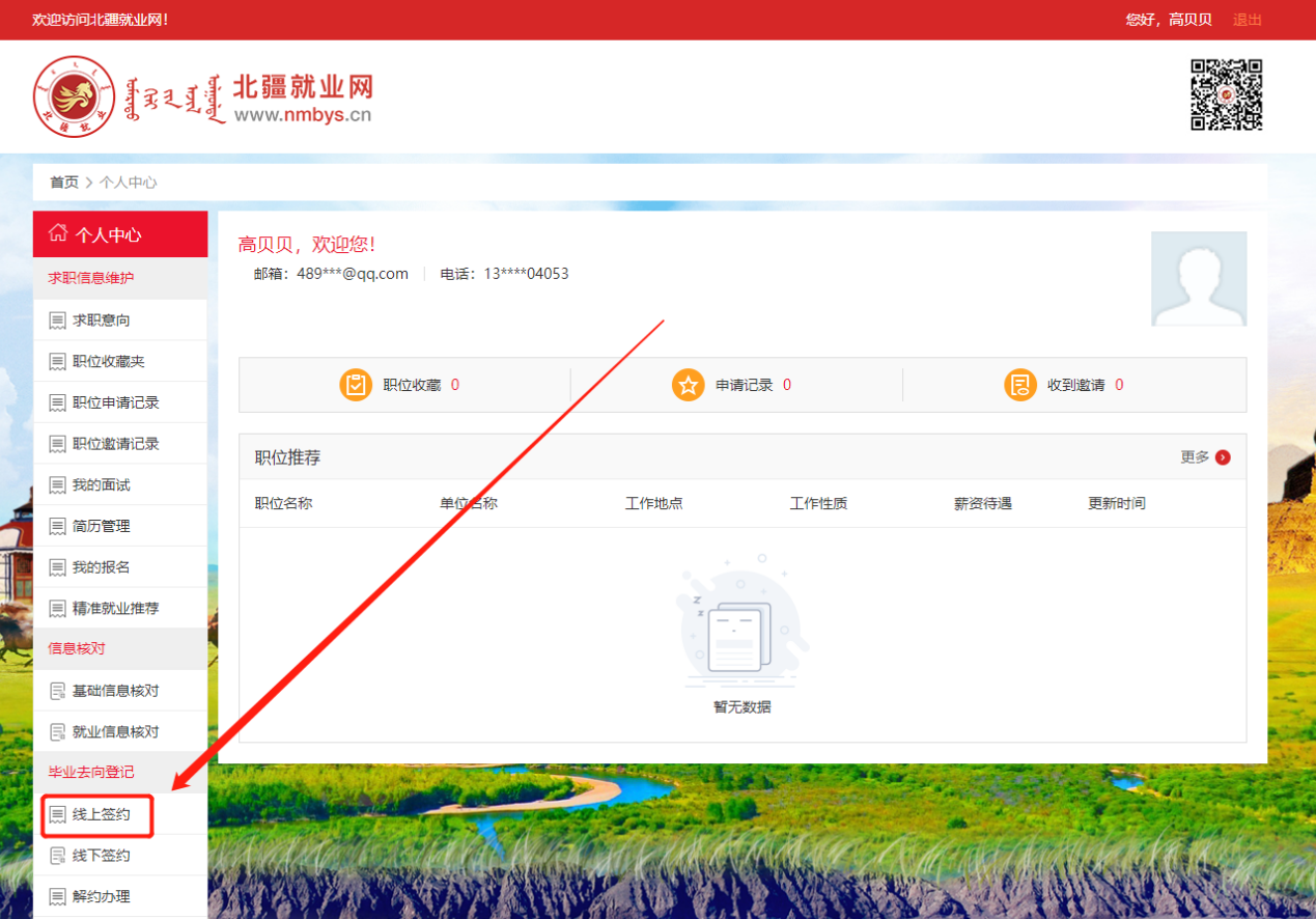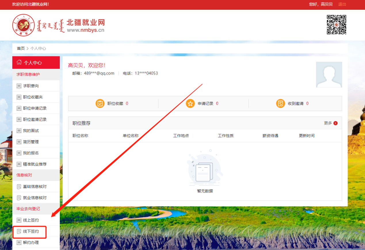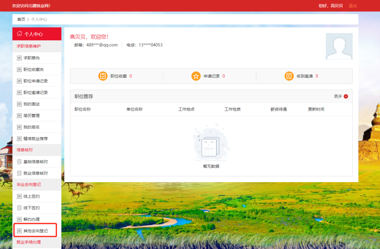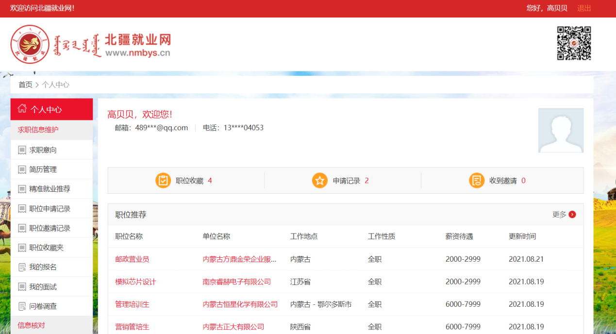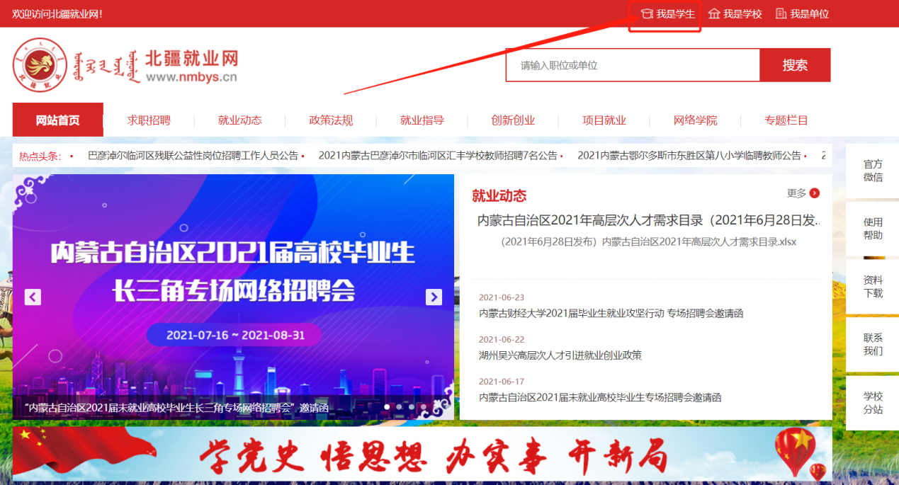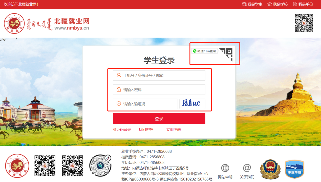在北疆就业网右上角点击我是学生输入账号密码或微信扫码进行登录(如未注册请点击“立即注册”进行注册),登录后进入学生中心。