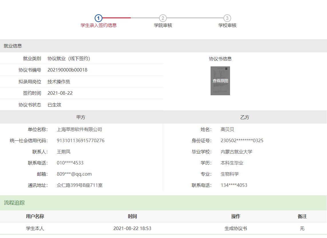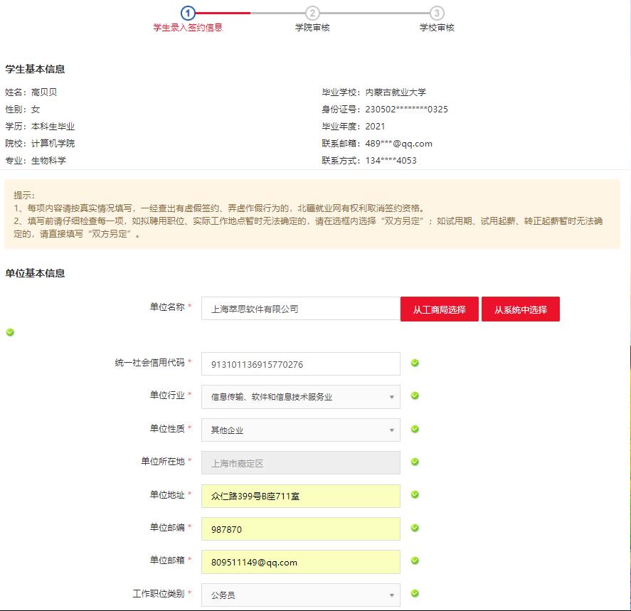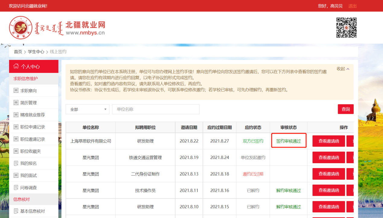 操作后,学生回到签约邀请列表,可持续关注老师审核的结果,如下图:签约审核通过,则此次签约完成,形成就业信息。审核不通过,学生可继续同其他单位签约。