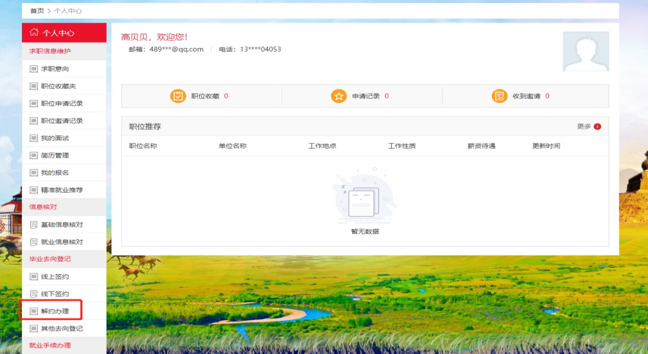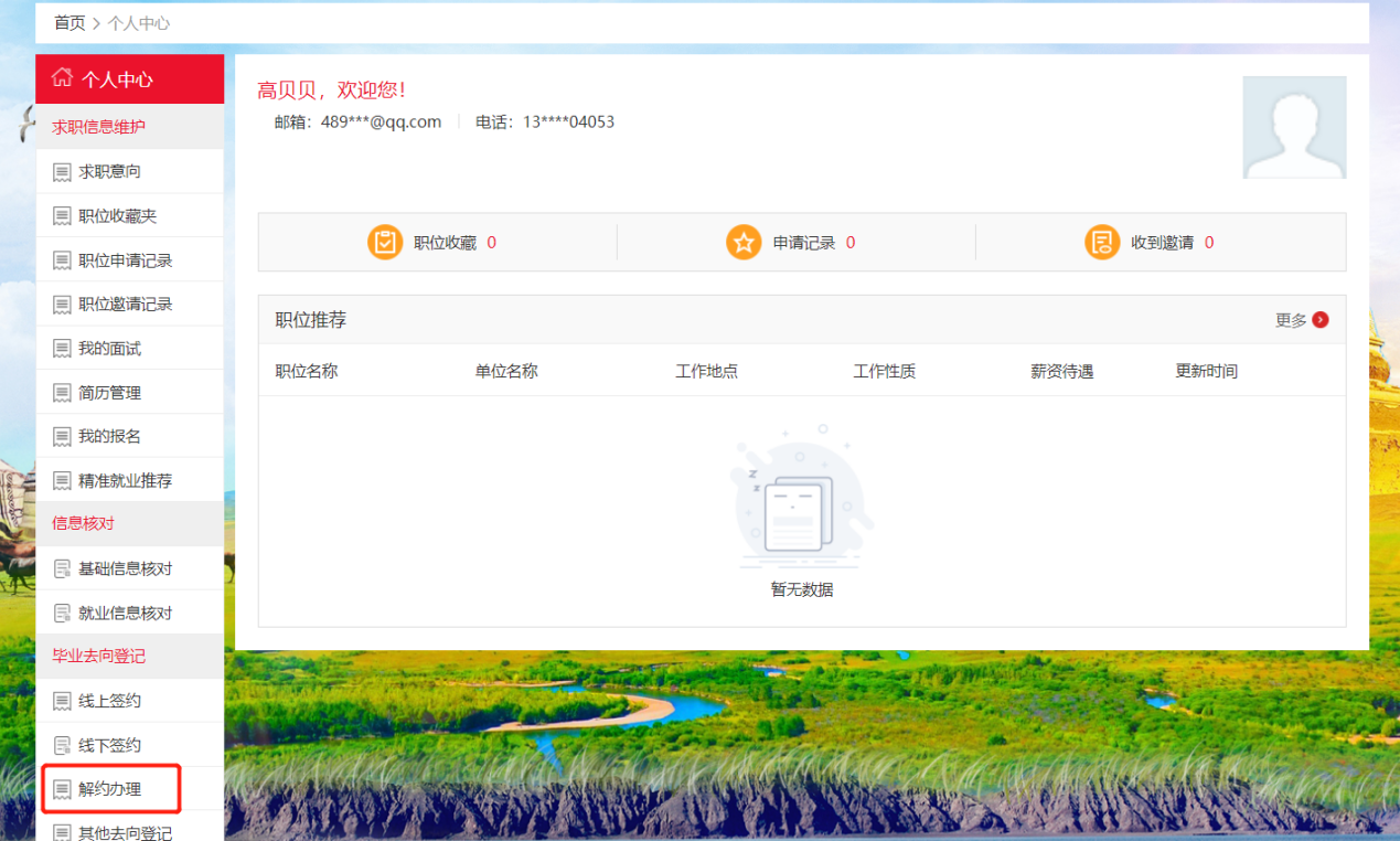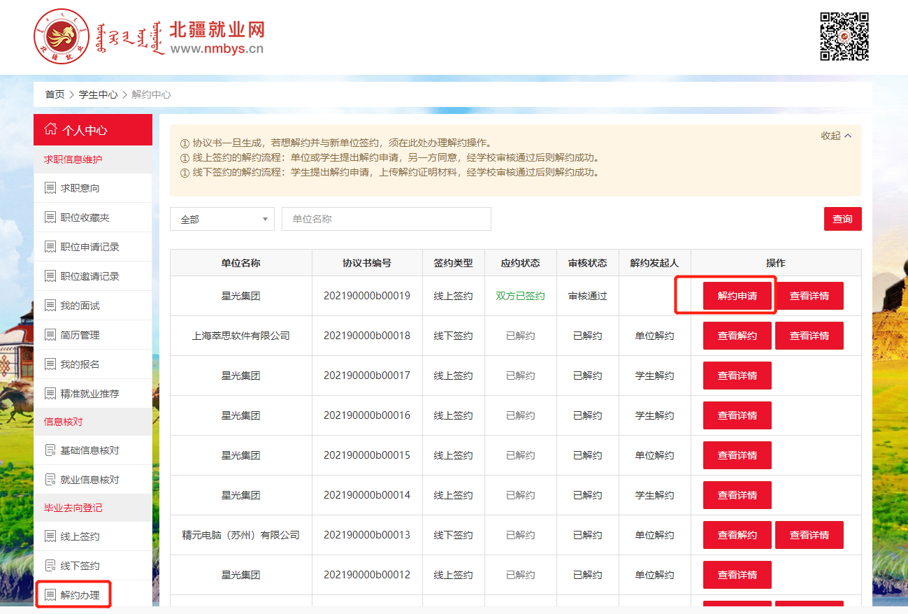 学生在个人中心-解约办理模块可以看到当前签约待审或审核通过的信息,通过条目右侧的“解约申请”按钮进行解约操作。