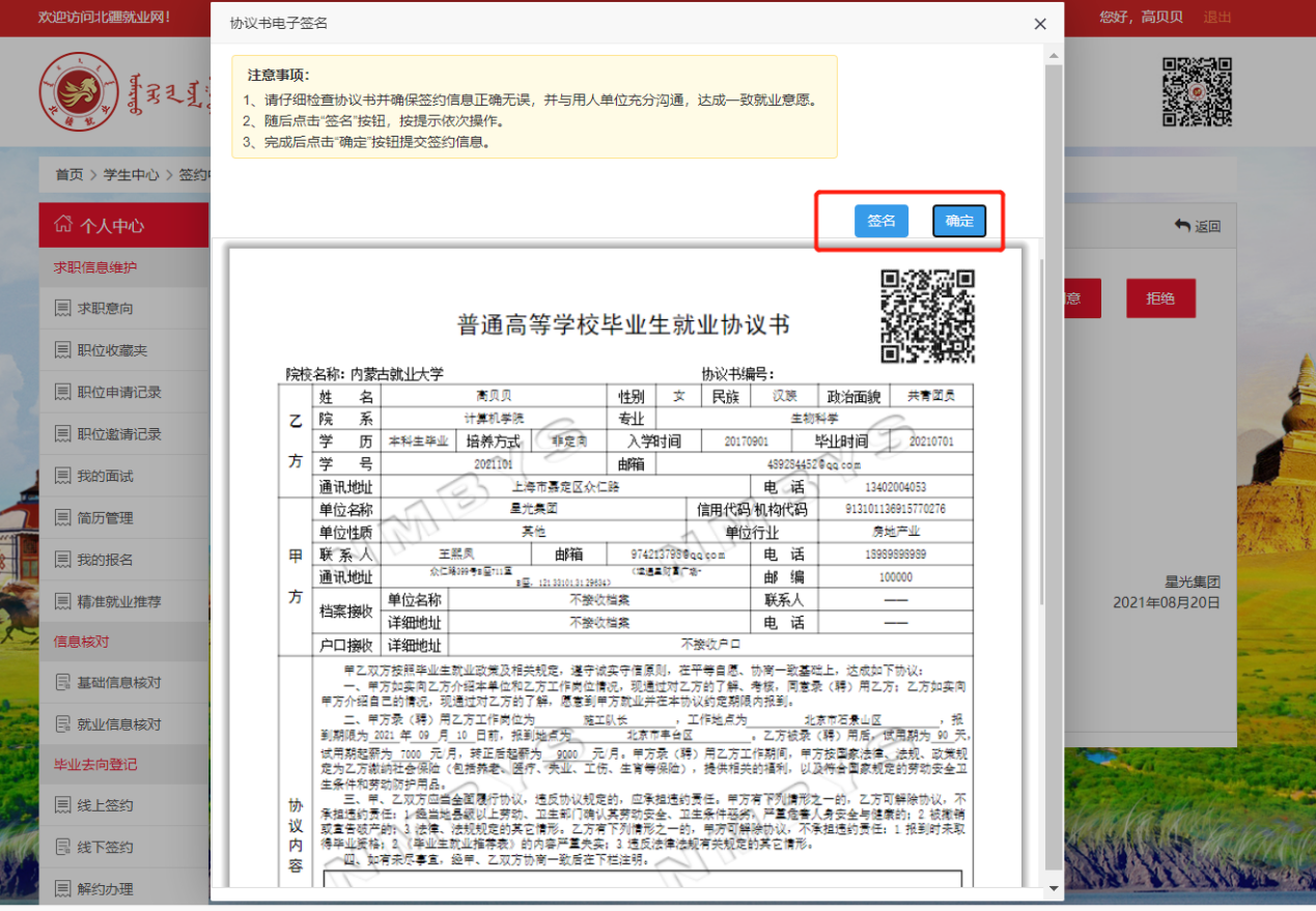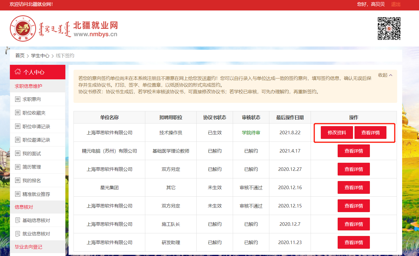 生成协议书后学生可以在查看详情处预览协议书,此时若协议书信息有误学生可点击“修改资料”重新编辑保存。
