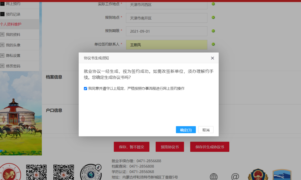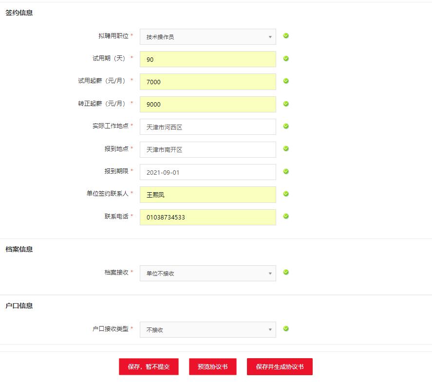 进入界面后,依次填写完整单位基本信息、签约信息、档案信息、户口信息,全部填写完整后,可以暂存并在下次继续填写。填写无误后,需先点击“预览协议书”确认无误后点击“保存并生成协议书”按钮,经二次确认后生成协议书。