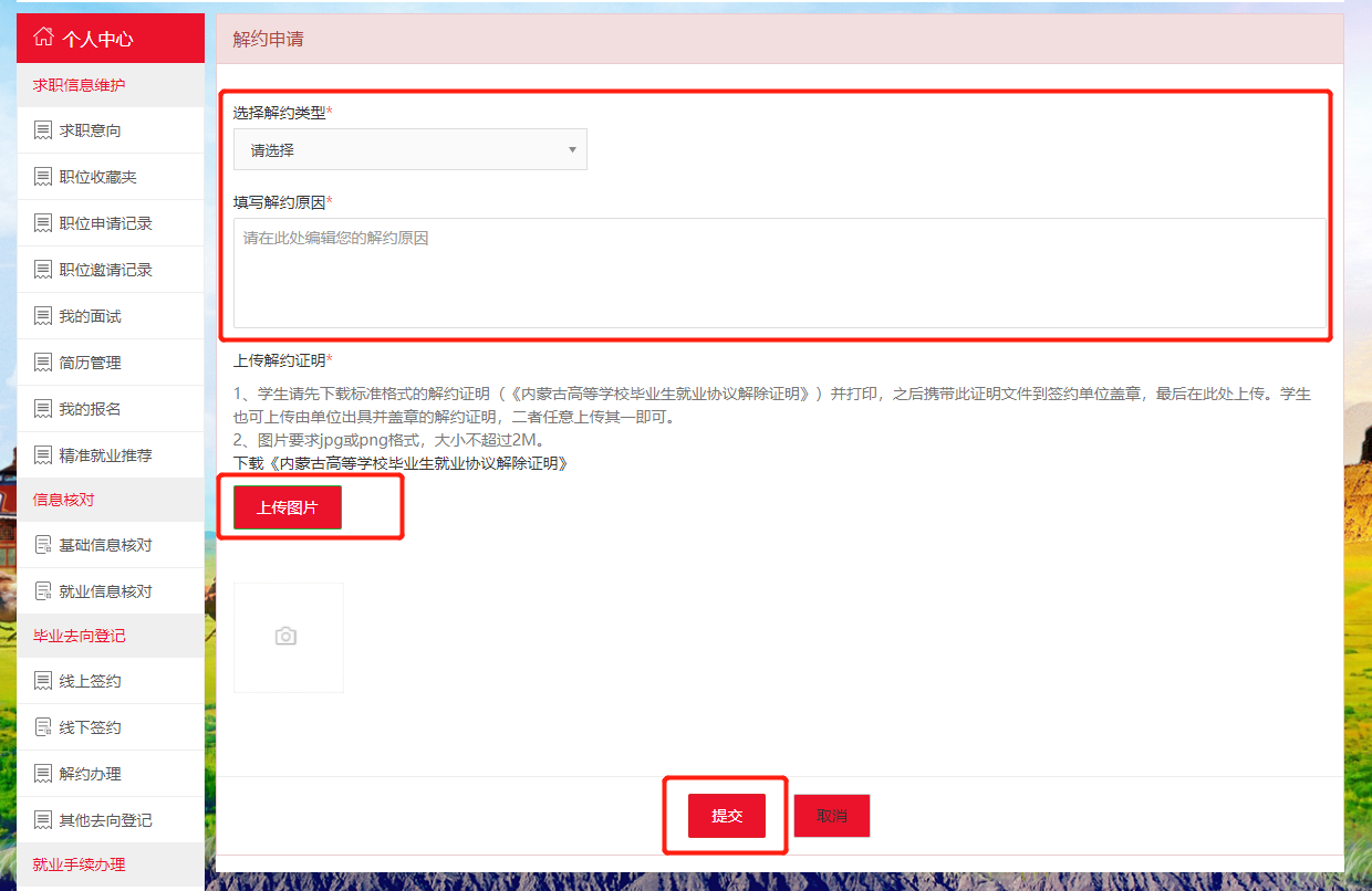 学生在解约申请页面选择解约类型、填写解约原因、上传解约材料,如线上签约则需要用人单位同意解约,线下签约则直接交由学校审核通过后才可完成解约。