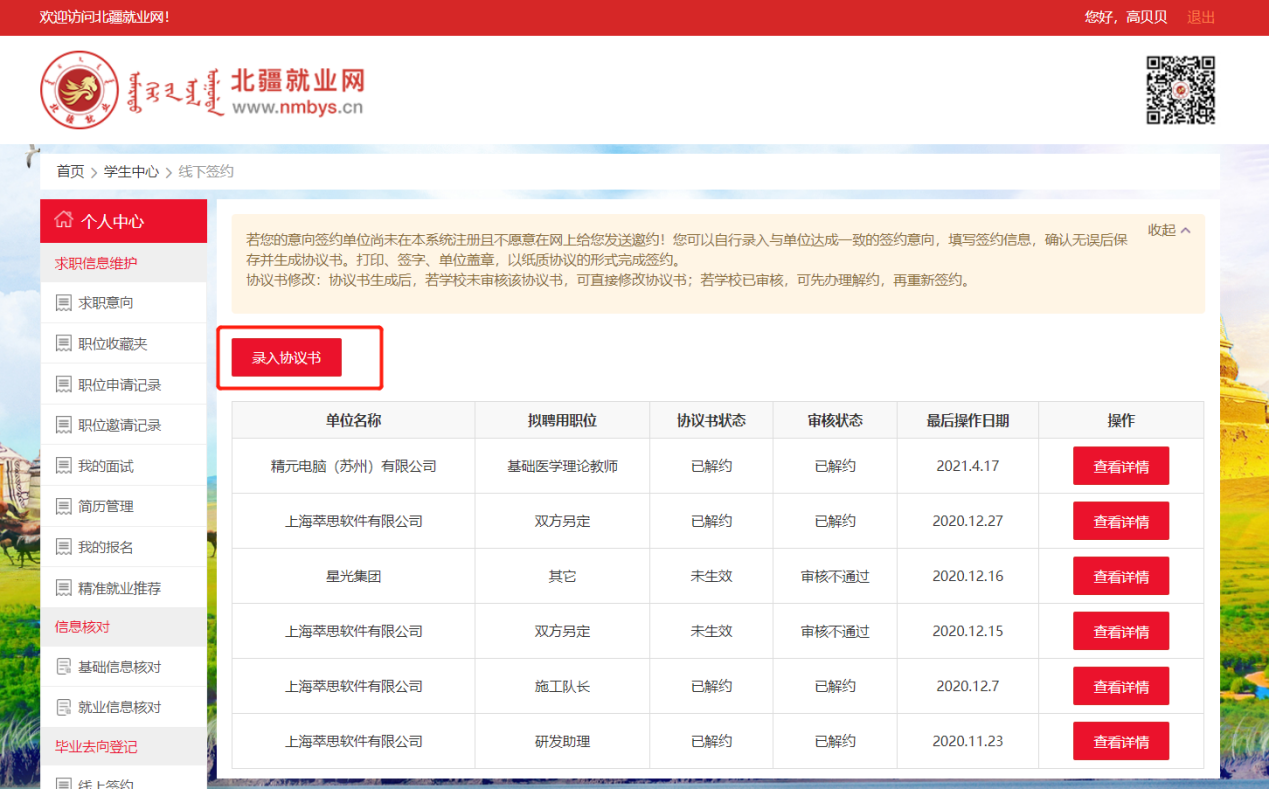 学生在个人中心->毕业去向登记->线下签约模块,点击“录入协议书”按钮,进入信息编辑界面。