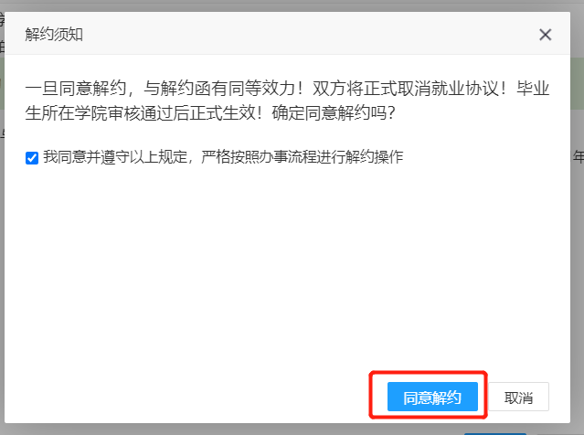 在单位的解约通知处可进行“同意”或“暂不处理”的操作,如点击同意则会有二次确认的弹框显示,确认后解约完成。如点击暂不处理则返回上一页面。