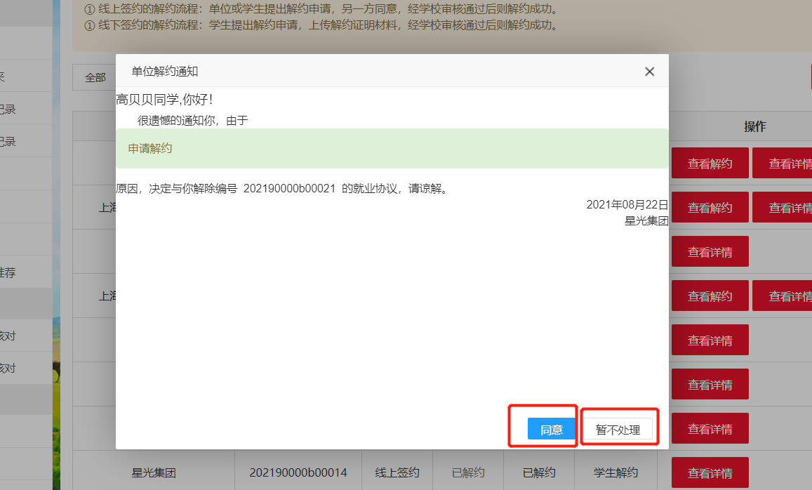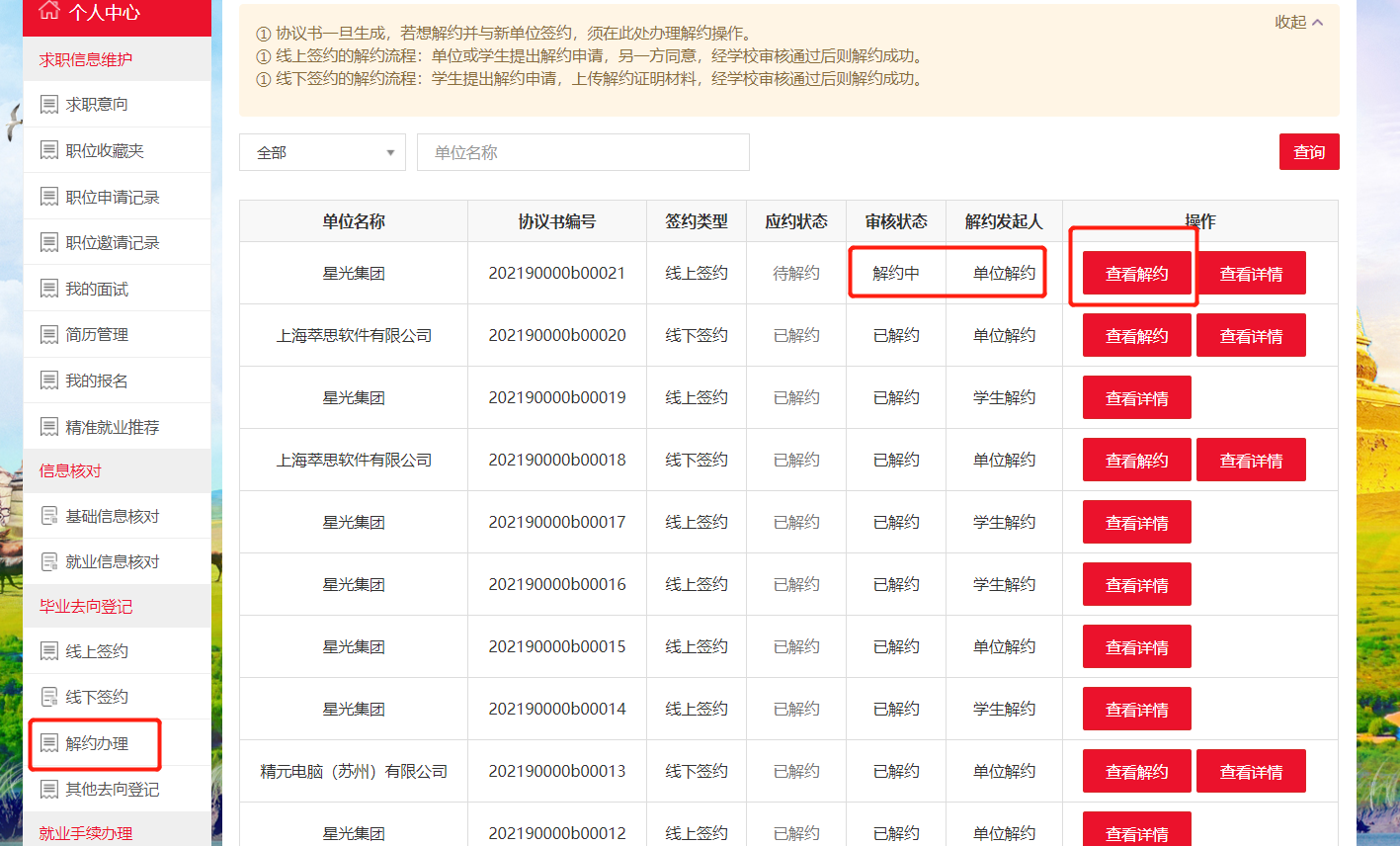 学生在个人中心-解约办理模块可以看到当前单位申请解约的信息。点击“查看解约”可看到单位的解约原因。