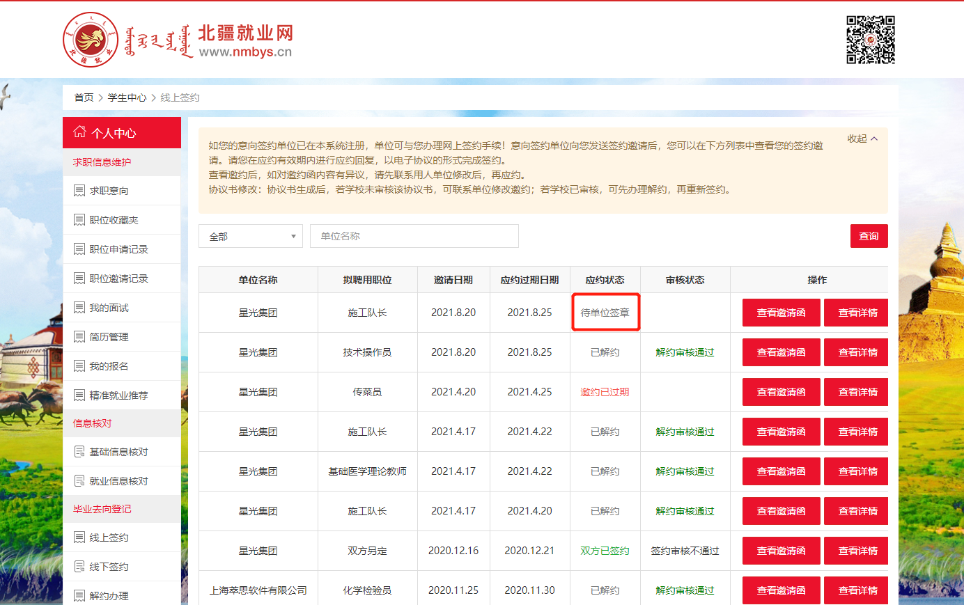 答:每个学生只能跟一个单位进行签约,签约后也能看到单位发来的邀约信息但只能查看无法操作,如想更换签约单位需跟上个单位解约后才可跟别的单位签约。