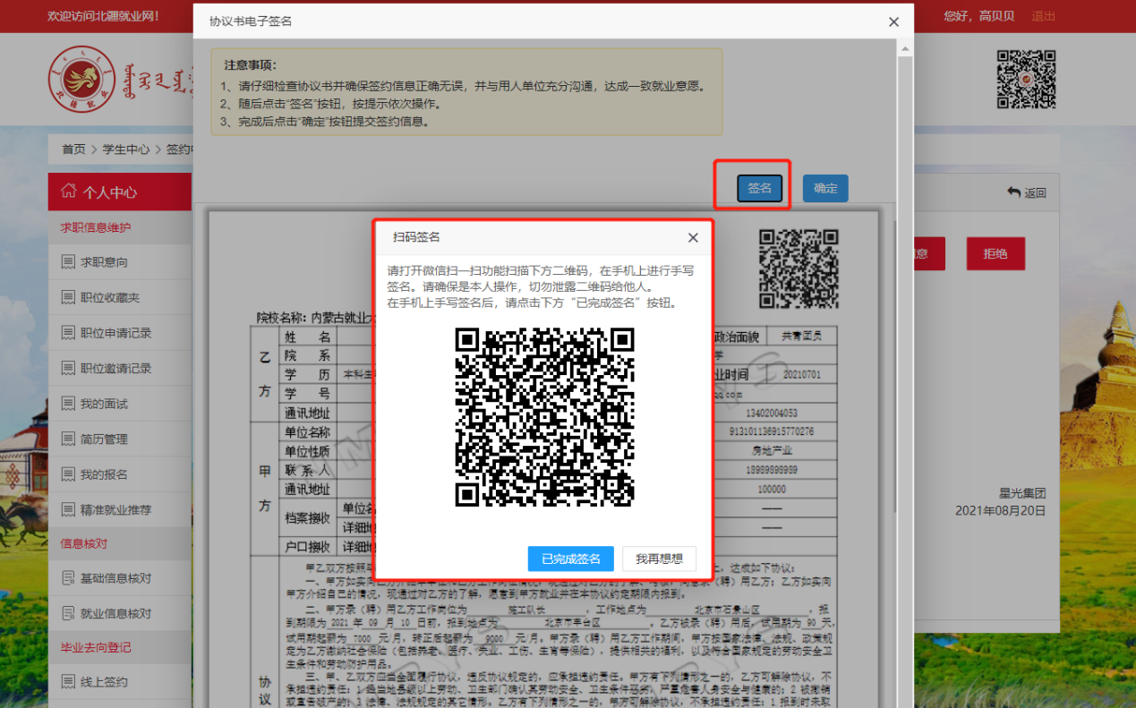 点击签名按钮后会弹出二维码进行扫码签名,签名后点击确认即可完成签名。