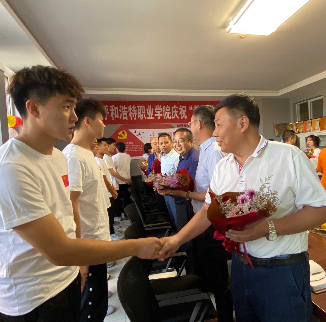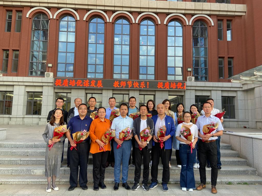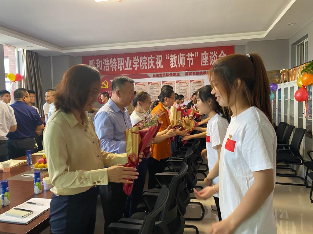 计算机系2021级新生代表手捧鲜花献给参加座谈会的每一位老师,并齐声祝福老师们节日快乐!计算机系教研室主任、专业带头人、班子成员等15位教师代表参加座谈会。