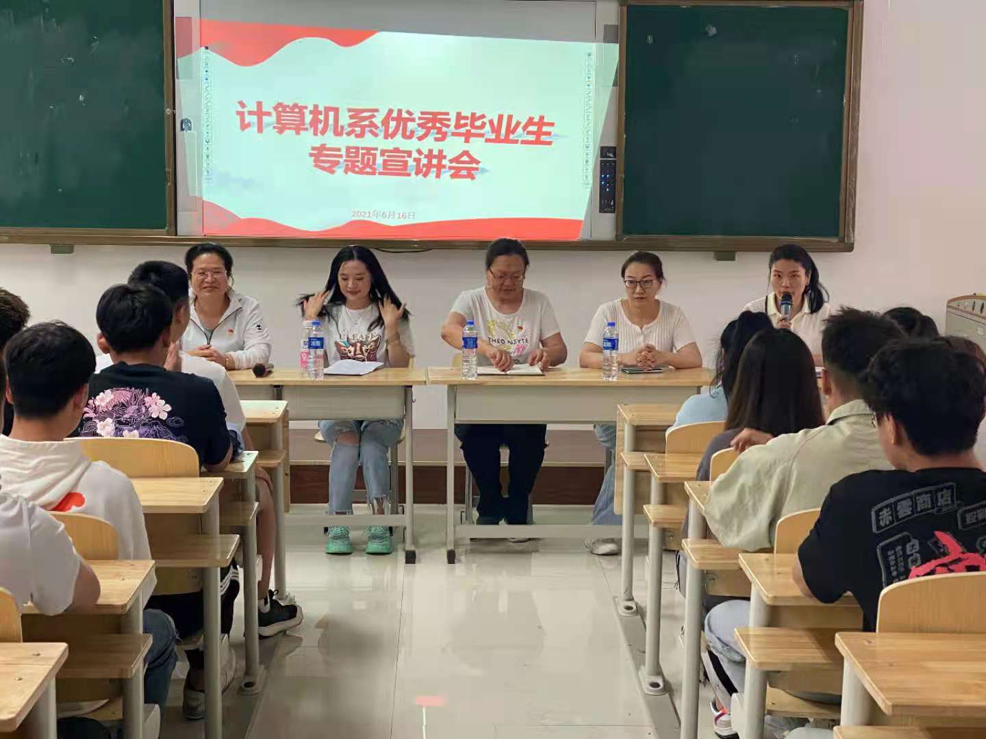 为进一步展现计算机系优秀毕业生风采,发挥榜样力量,6月16日下午,计算机系开展2021年优秀毕业生专题宣讲会。计算机系主任杨丽、副主任王瑾瑜、副主任吴和群,2019级电子商务班、大数据应用技术专业全体同学参加了本次会议。