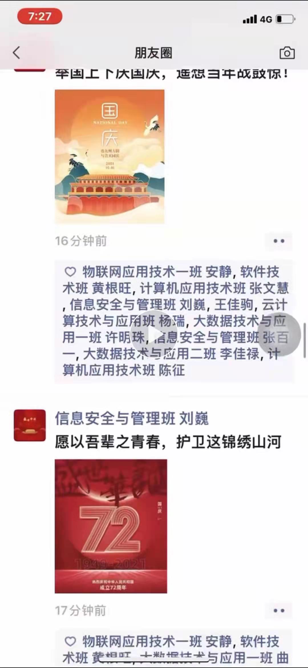 9月30日,计算机系团总支在敏学楼二楼组织开展“我和国旗和个影”活动,学生们以不同的方式与五星红旗合影,述说爱国之情,用创新创意的方式礼赞新中国;同时,时刻提醒着同学们要传承爱国之情,弘扬报国之志,为伟大的祖国贡献力量。国庆当天,计算机系团总支发起“更换爱国微信头像”活动,学生们纷纷选择国旗国徽的微信头像,并发送国庆主题朋友圈。通过这一新颖的线上活动,引领学生用纯真的话语来表达对祖国母亲的祝福,为中华人民共和国成立72周年献礼。