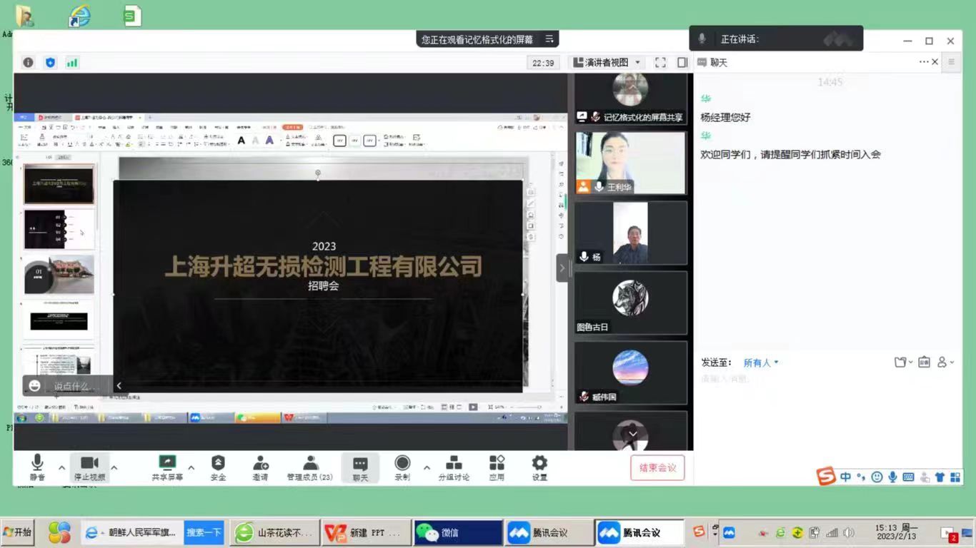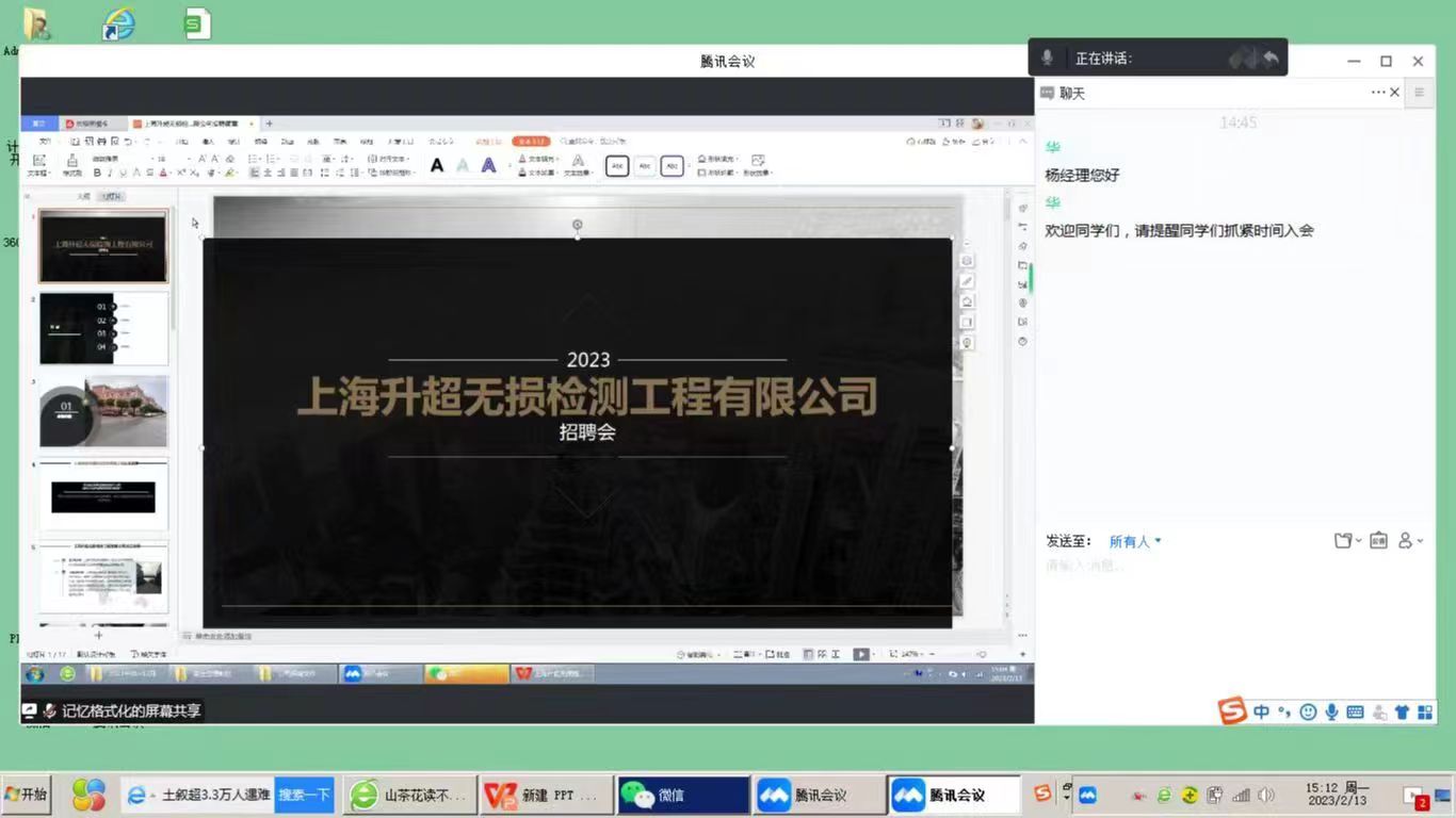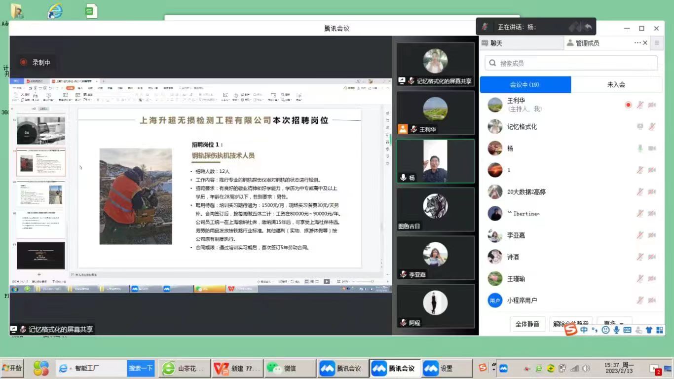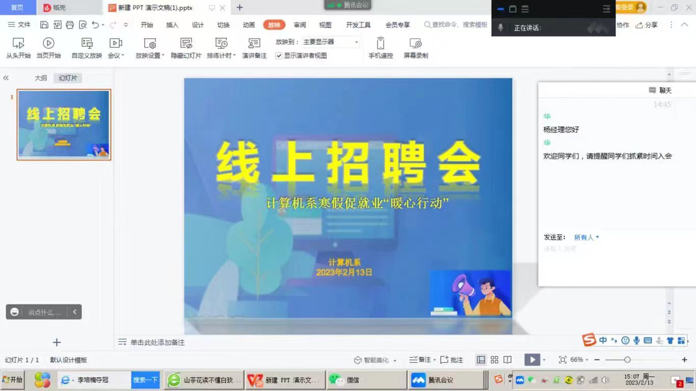 为促进计算机系2023届毕业生高质量就业,计算机系于2月13日下午利用腾讯会议,举办第七场线上招聘宣讲会,推进学生就业工作。计算机系副主任王瑾瑜、就业科科长王利华、软件教研室主任李亚嘉、全体20级班主任辅导员、2023届全体学生参加。