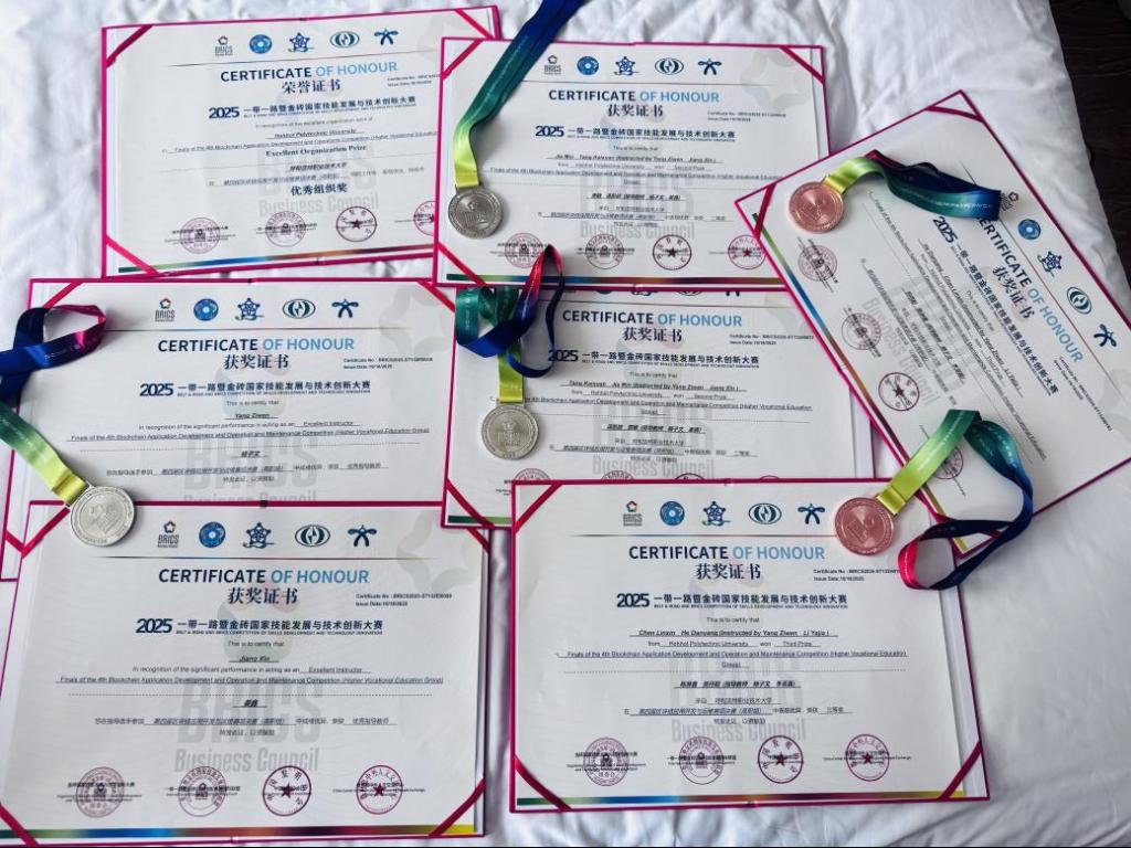 近日,2025 年一带一路暨金砖国家技能发展与技术创新大赛——第四届区块链应用开发与运维赛项全国总决赛,在乐山职业技术学院圆满落幕。比赛吸引了来自全国的近 154 支队伍参赛,竞争激烈。计算机系选派两组学生凭借扎实的技术、创新的方案与稳定发挥,最终斩获高职组二等奖 1 项、三等奖 1 项, 2 人获优秀指导老师,呼和浩特职业技术大学荣获优秀组织奖 1 项。