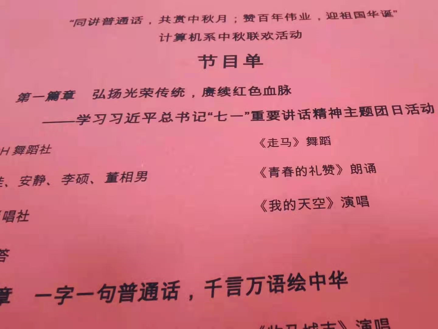 本次活动由“弘扬光荣传统,赓续红色血脉”“一字一句普通话,千言万语绘中华”“海上生明月,天涯共此时”三个篇章组成。诵读、舞蹈、演唱、说唱、绕口令比赛、诗歌飞花令等丰富多彩的节目和游戏让同学们直观的感受到普通话的魅力、学习了践行社会主义核心价值观的意义,体现了同学们的知识储备和对传统节日的热爱。同学们齐唱《明月几时有》使整个活动推向了高潮,最后在悠扬的口琴演奏《难忘今宵》中结束本场活动。