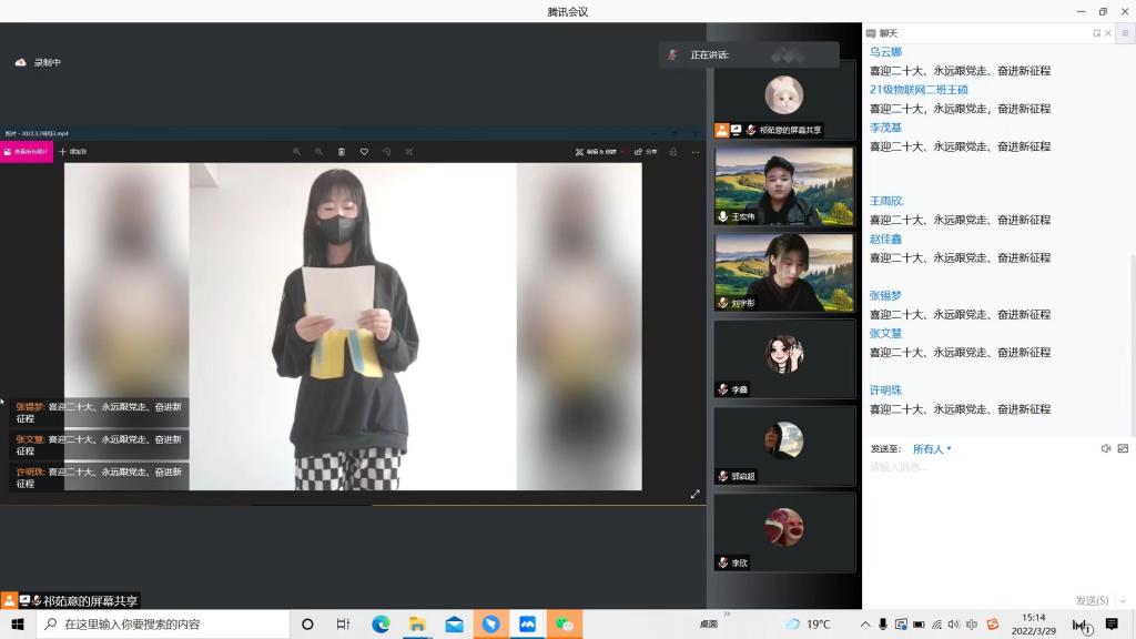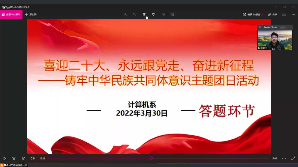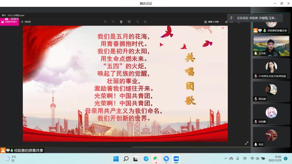为贯彻习近平新时代中国特色社会主义思想,进一步巩固党史学习教育成果,推进民族团结深入民心,铸牢中华民族共同体意识,迎接党的二十大召开,计算机系团总支于2022年3月29日下午三点在腾讯会议组织“喜迎二十大、永远跟党走、奋进新征程——铸牢中华民族共同体意识”线上主题团日活动。系团总支书记张书恒、全体团学干部、全体团支书及部分同学参加本次线上团日活动。