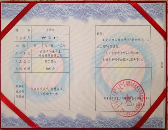 内蒙古自治区新世纪“321 人才工程” 第三层次人才二层次(2021 ,王雪松)