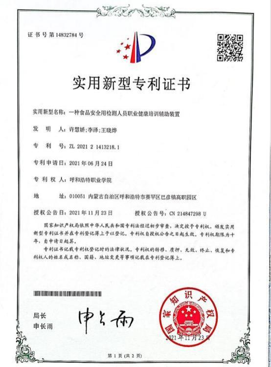 一种食品安全用检测人员职业健康培训辅助装置专利证书