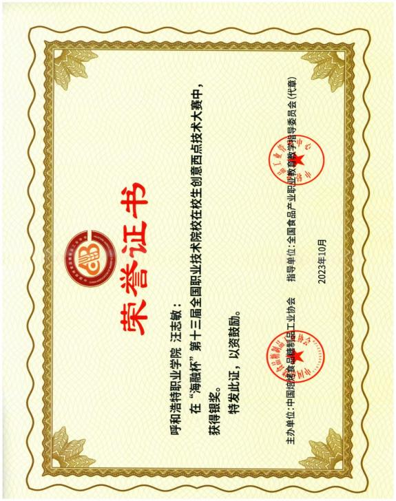 上一条:在“海融杯”第十三届全国职业技术院校在校生全国 食创意西点技术大赛中,获得银奖(汪志敏) 下一条:在“海融杯”第十三届全国职业技术院校在校生全国 食创意西点技术大赛中,获得银奖(沈嘉琪)