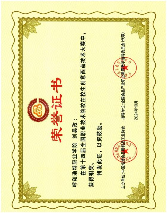 在第十四届全国职业技术院校在校生全国食创意西 点技术大赛中,获得铜奖(刘昊政)
