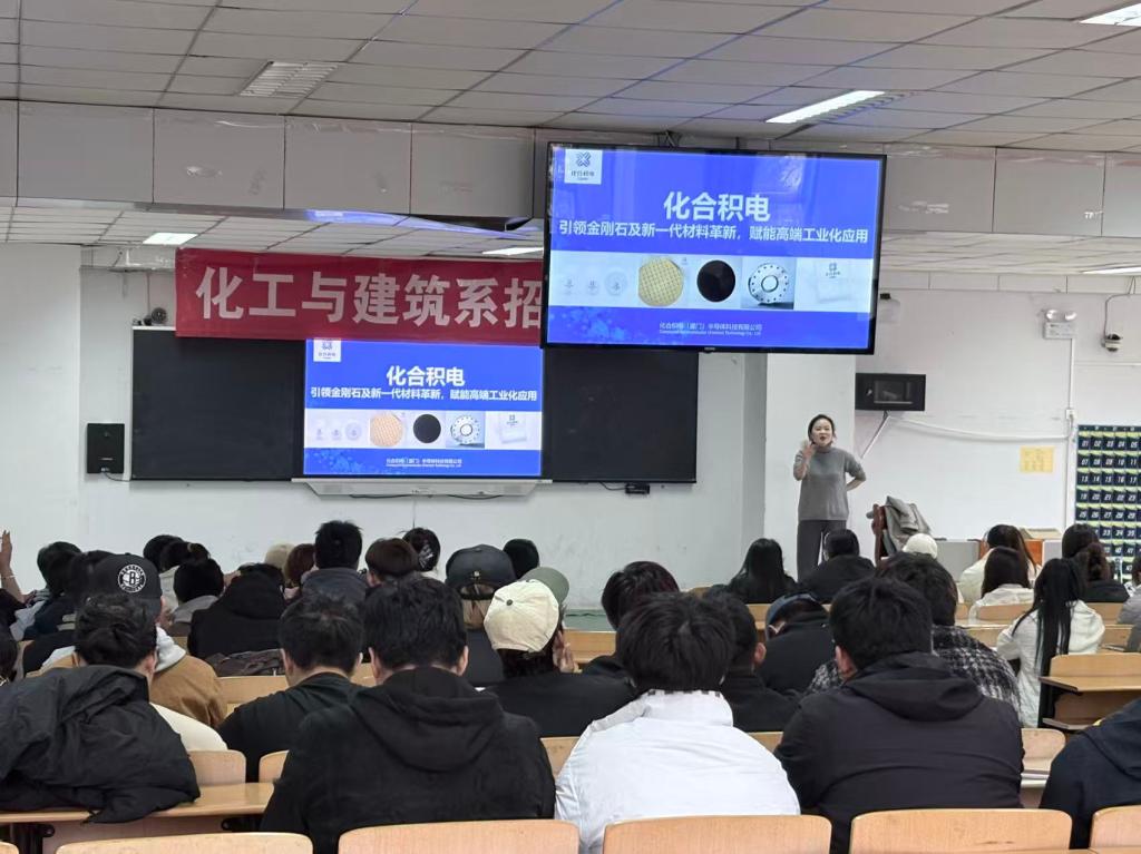 活动中,杨云辉总监详细介绍了企业的发展历程、核心产品(金刚石衬底、热沉片、光学片等)、技术布局及用人需求,重点展示了金刚石材料在半导体、散热、光学等领域的应用前景,并与到场的应用化工专业学生深入沟通岗位适配性、职业发展路径及薪资福利等问题,现场学生参与热情高涨,部分学生已与企业达成初步求职意向。