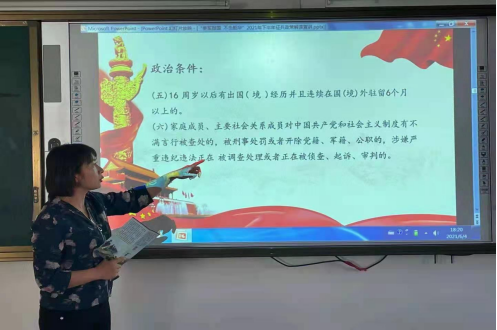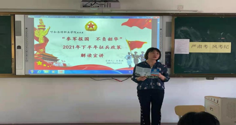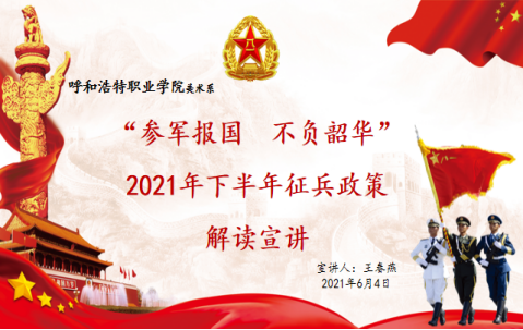 为切实做好2021年下半年征兵工作,激发广大青年大学生参军报国热情,美术系结合上级文件精精神,于6月4日晚6:00在4号楼301开展“参军报国 不负韶华”2021年下半年征兵政策解读宣讲,由学团科科长王春燕主讲,19-20级全体学生参加了宣讲会。
