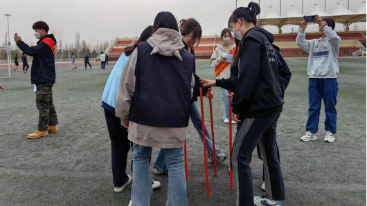 “眼疾手快”小队人员每人扶着一根棒子,顺时针旋转,去接下一个人手里的棒子,棒子不能落地,要求队员步伐一致,共同进退,口号一致,目标一致,立德树人。