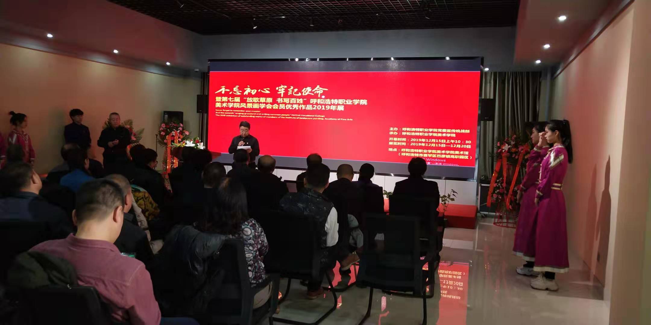 2019年12月15日上午“不忘初心牢记使命”暨第七届“放歌草原、书写百姓”呼和浩特职业学院美术学院风景画学会会员优秀作品2019年展在呼和浩特职业学院美术学院美术学院一楼美术馆举行。呼和浩特市委宣传部常务副部长李文阁,呼和浩特市文联党组书记郭林贵、主席云巧堂和呼和浩特市九个旗县区美术家协会主席参加开幕式。