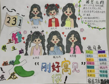 活动过程中,各宿舍成员齐心协力,充分发挥美术专业优势,将色彩搭配、图案设计、字体创意等专业技能运用到公约设计中。有的宿舍以“温馨家园,文明同行”为主题,采用温暖柔和的色调,绘制出宿舍成员共同生活的温馨场景,搭配简洁易懂的文明条款;有的宿舍则结合当下流行元素,以动漫风格呈现公约内容,生动有趣的画面让人眼前一亮;还有的宿舍从传统文化中汲取灵感,融入水墨、剪纸等元素,使公约充满文化韵味。在设计过程中,同学们不仅注重美观性,更深入探讨文明公约的具体内容,围绕卫生清洁、作息时间、人际交往、安全规范等方面展开热烈讨论,制定出符合宿舍实际情况、切实可行的文明准则。