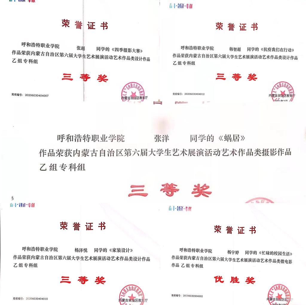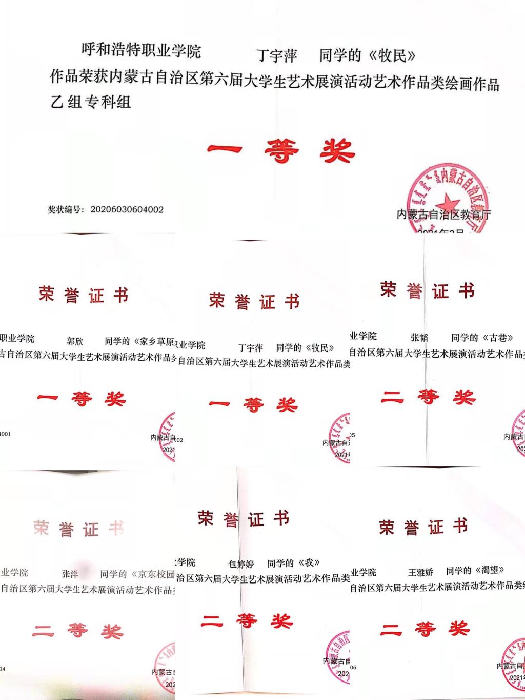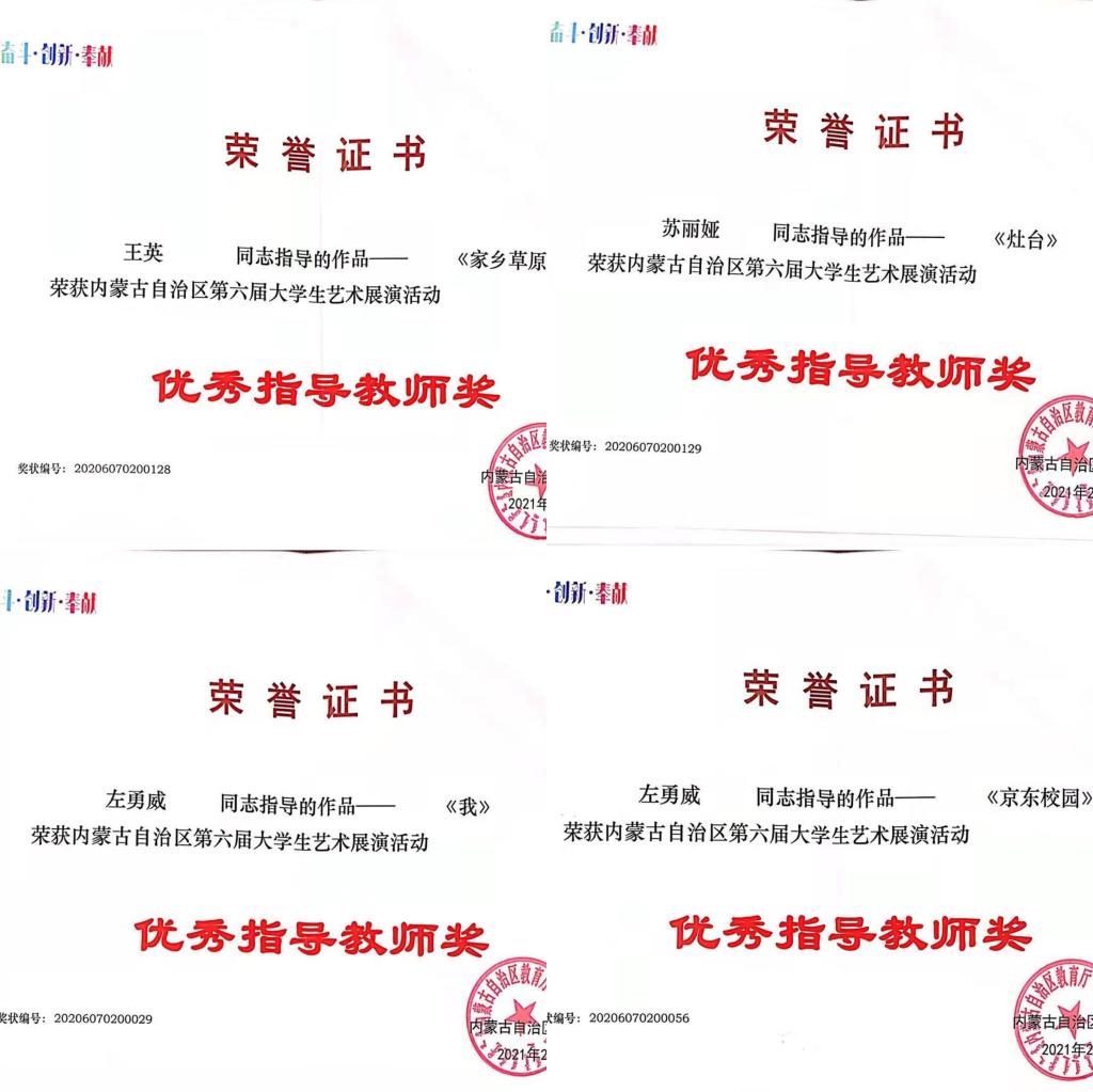 近日,由内蒙古教育厅主办、内蒙古艺术学院承办的内蒙古自治区第六届大学生艺术展演活动圆满落幕,全区50所本专科院校参与活动。经过线上投票、线下评审等环节,我院选送的艺术作品及案例作品中,美术系丁宇萍同学的《牧民》及郭欣同学的《家乡草原美》作品荣获艺术作品类绘画作品乙组专科组一等奖,张韬同学的《古巷》及王雅娇同学的《渴望》作品荣获艺术作品类绘画作品乙组专科组二等奖,张洋同学的《京东校园》作品荣获艺术作品类设计作品乙组专科组二等奖,韩智趋同学的《抗议我们在行动》、张趋同学的《四季摄影大赛》及杨泽悦同学的《家装设计》作品荣获艺术作品类设计作品乙组专科组三等奖,包婷婷同学的《我》作品荣获艺术作品类摄影作品乙组专科组二等奖,张洋同学的《蜗居》作品荣获艺术作品类摄影作品乙组专科组三等奖,杨宇婷同学的《忙碌的校园生活》作品荣获艺术作品类微电影作品乙组专科组优胜奖。王英老师指导的作品《家乡草原美》,苏丽娅老师指导的作品《灶台》,左勇威老师指导的作品《京东校园》、《我》荣获内蒙古自治区第六届大学生艺术展演活动优秀指导教师奖。