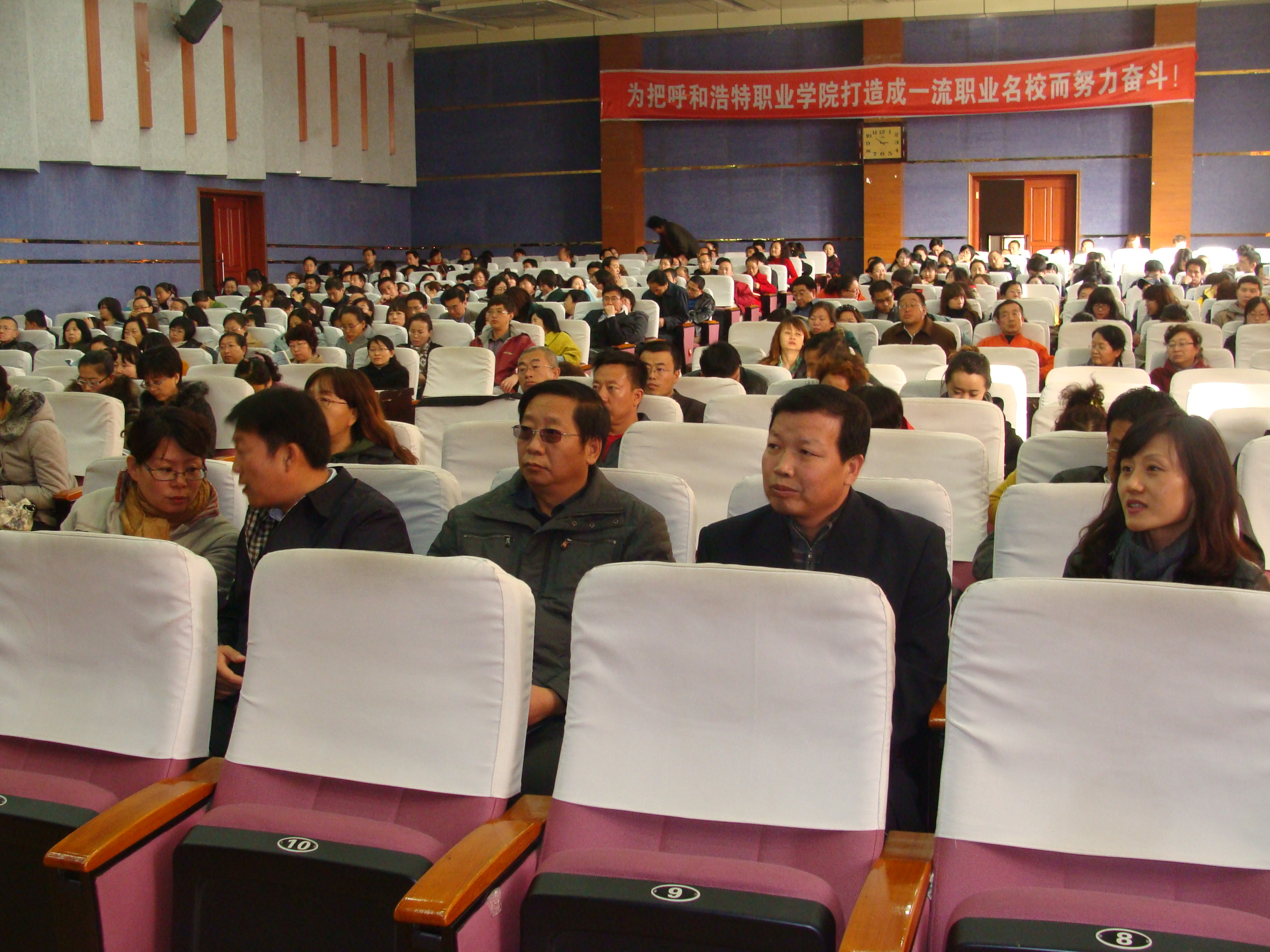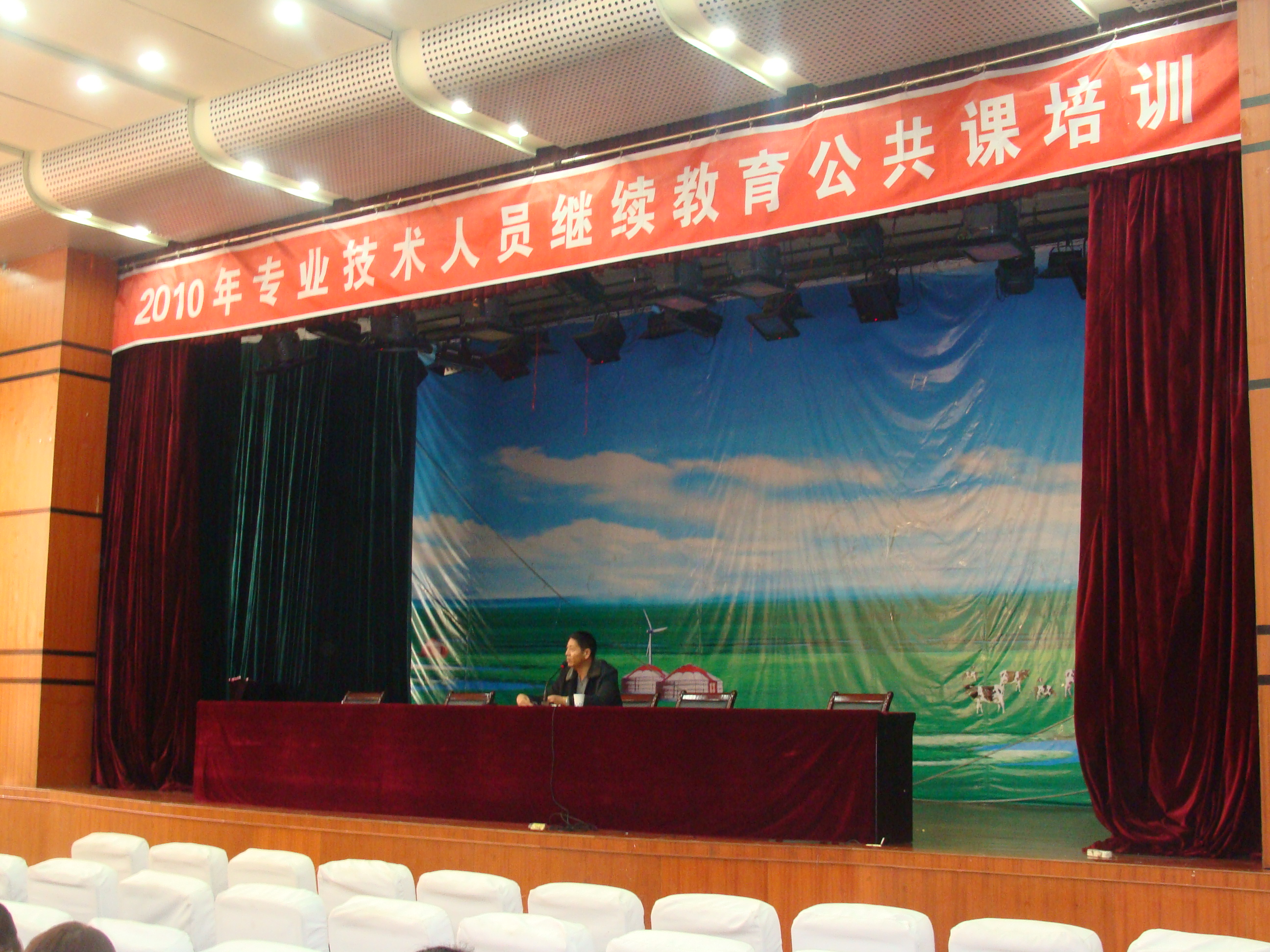 根据《呼和浩特市人民政府关于印发< 呼和浩特市专业技术人员继续教育管理暂行办法>的通知》,呼和浩特职业学院于2010年11月10日在百年讲坛举办了专业技术人员继续教育公共课培训,此次培训由呼和浩特职业学院组织人事处和培训学院共同举办。呼和浩特职业学院党委副书记董鹏、组织人事处处长王喜全、组织人事处专技科科长殷华陪同呼和浩特市人事局副局长云鉴及专技科科长赵雍卓对培训学习现场进行了检查指导,培训工作受到市级领导的好评。此次培训特聘请了内蒙古师范大学张拓书教授进行了关于《创新能力建设:专业技术人员创新案例》的讲座,在工作人员和全体培训教师的共同努力下圆满的完成了学习任务。