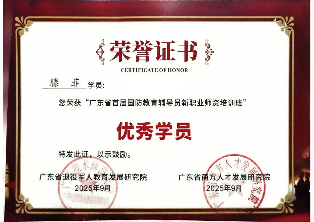 培训部滕菲老师参加本次培训,通过理论与实操考核等环节取得国防教育辅导员师资证书并荣获优秀学员称号。通过本次培训,既对表对标先进示范学校培训模式,又与相关单位建立了联系,进一步落实内蒙古退役军人产业学院建设规划,为我院申请国防教育辅导员培训考试资质奠定了基础。