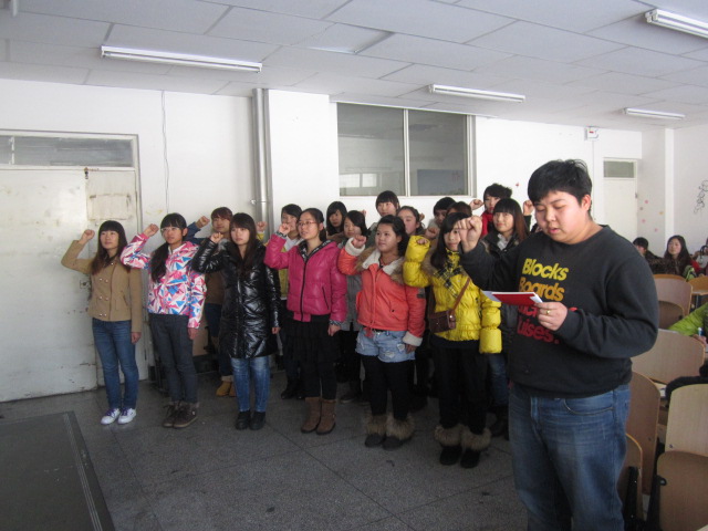 会议分为三个内容,第一个内容是预备党员的宣誓仪式,在吕洋老师的带领下,同学们举起右拳在神圣而庄严地党旗下进行了宣誓。第二个内容,会上于文博老师带着我们学习十八大报告,为了让预备党员们及时了解十八大的内容、领会十八大精神和实旨。为今后更好的学习指明方向。第三,由刘敏华书记作了讲话,她对我们预备党员今后的工作提出了要求和希望,她说:“党员是一面旗帜,在实际学习中发挥党员作用,体现党的先进性,时刻用党员的身份来要求和约束自己。在工作上要用心、脚踏实地。”