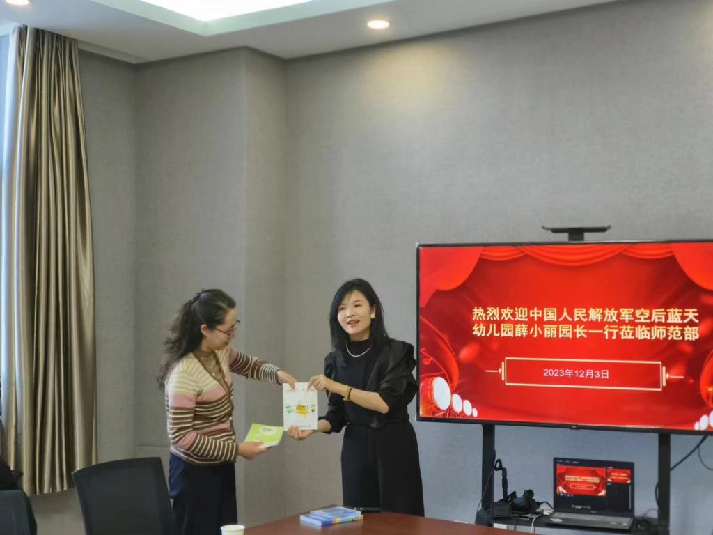 最后薛小丽园长将空后蓝天幼儿园的特色课程相关书籍赠送给了师范部,希望能对老师和同学们有一定的帮助,李江南主任作为师范部代表接受了赠送并表达了真挚的谢意。