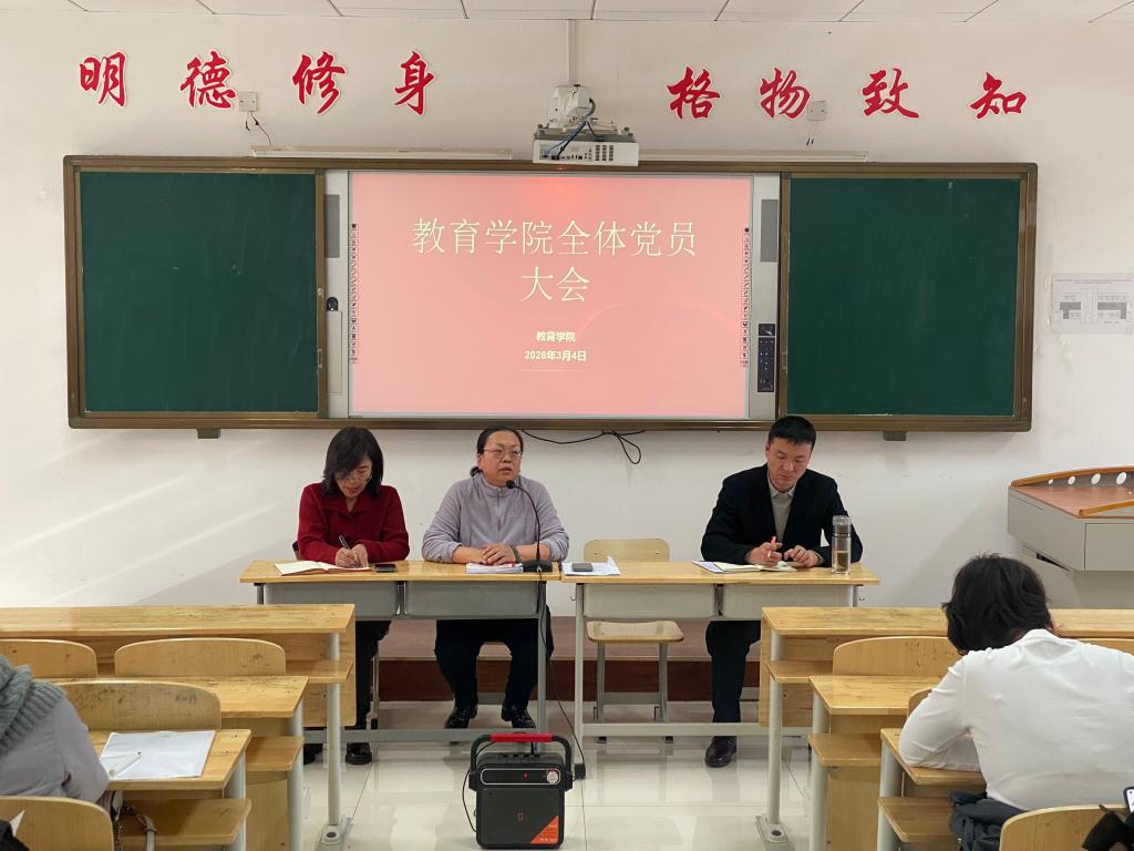 2026年3月4日,教育学院在明学楼 127 会议室召开全体党员大会,学院党总支书记杨丽主持会议,教育学院全体教师参会。