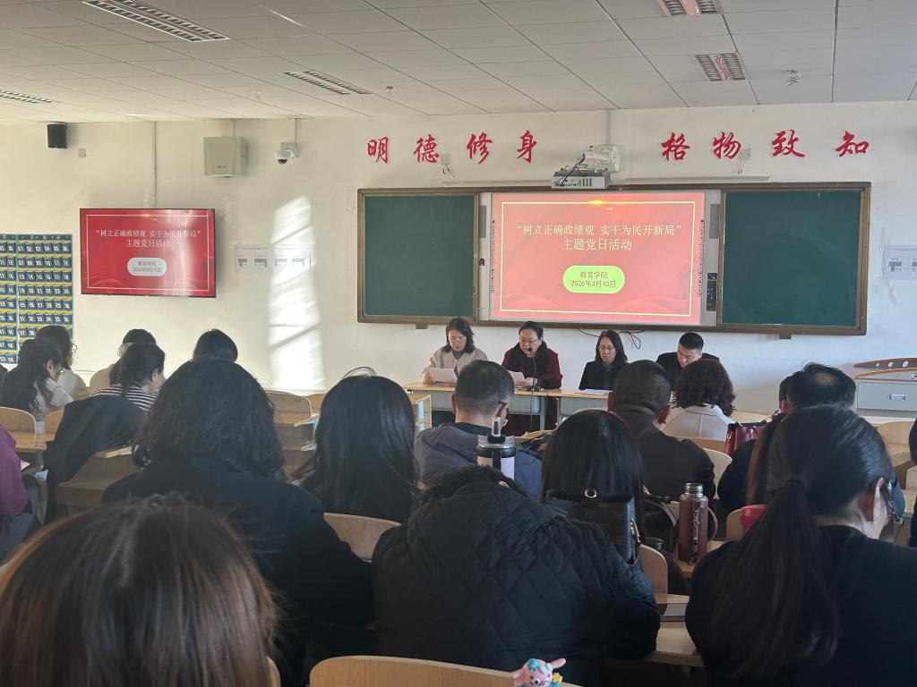 2026年3月10日,教育学院在敏学楼 127 阶梯教室开展 “树立正确政绩观,实干为民开新局” 主题党日活动,本次主题党日是教育学院党总支贯彻落实上级党委部署,树立践行正确政绩观在教育学院的启动动员部署会,活动由党总支书记杨丽主持,学院全体教职工参加。