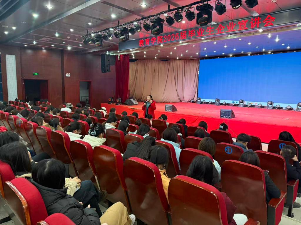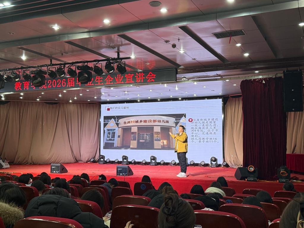 为进一步推进人才培养质量,切实做好我校对口专业岗位就业,11月18日下午在图书馆一楼报告厅,开展了教育学院2026届毕业生企业宣讲会活动。